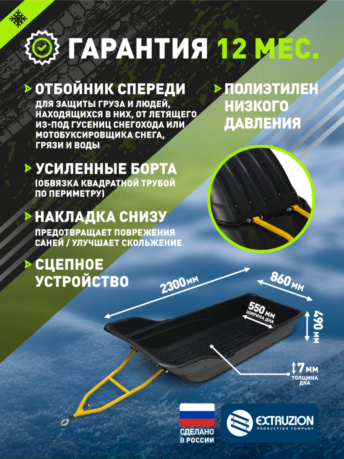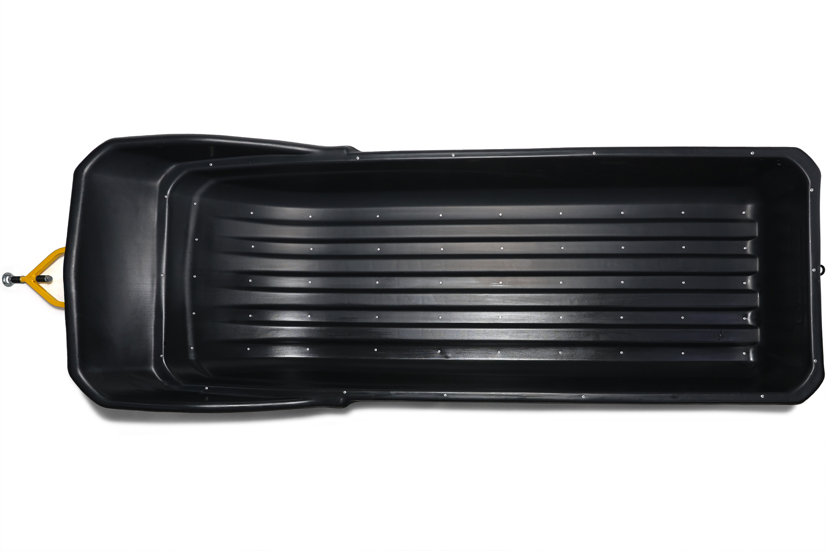 Преимущества конструкции. Узкое дно шириной 550 мм обеспечивает превосходную проходимость по глубокому снегу Сбалансированная геометрия корпуса гарантирует устойчивость на сложном рельефе Увеличенная длина позволяет транспортировать длинномерные предметы Накладные полозья значительно улучшают скольжение и увеличивают ресурс эксплуатации