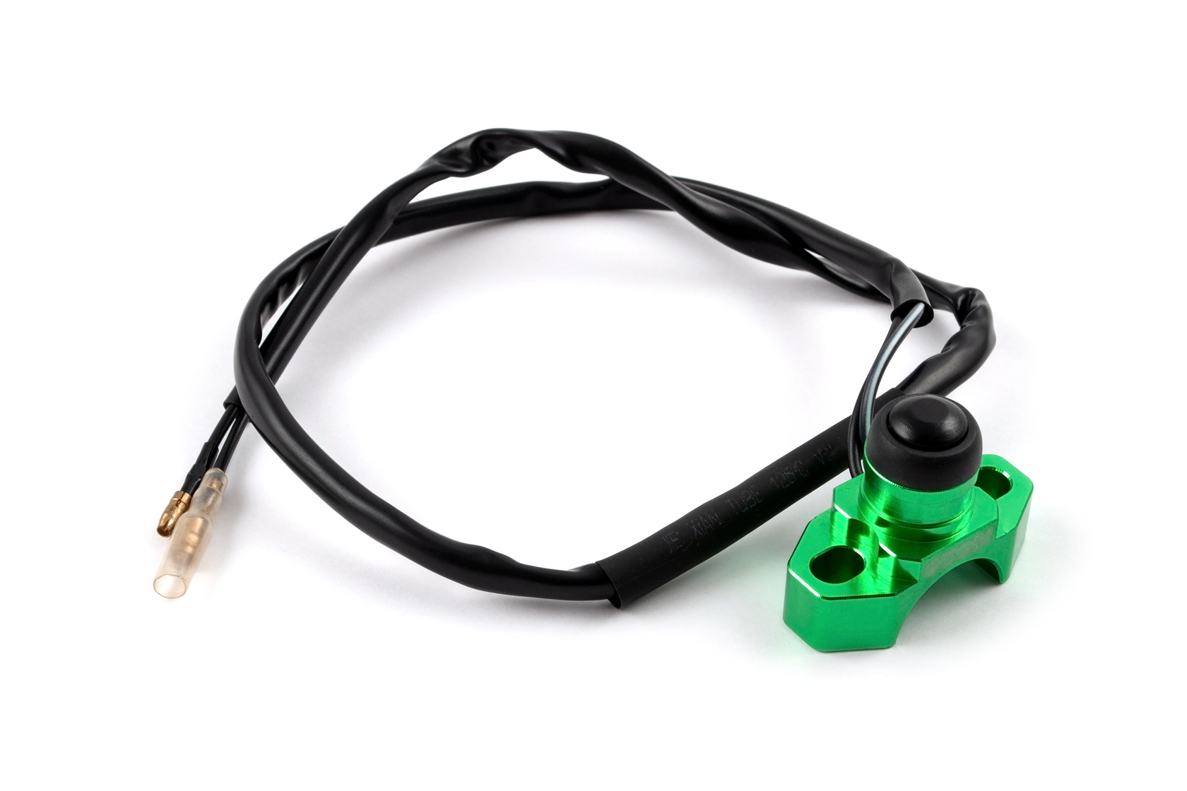 Универсальная кнопка запуска и остановки двигателя OTOM зеленого цвета. Выполняет функции включения или выключения двигателя в зависимости от схемы подключения. Корпус изготовлен из CNC алюминия, обеспечивает надежную влагозащиту. Стандартное крепление двумя болтами вместо штатного рычага сцепления или тормозной машинки. Подходит для установки как с левой, так и с правой стороны руля.