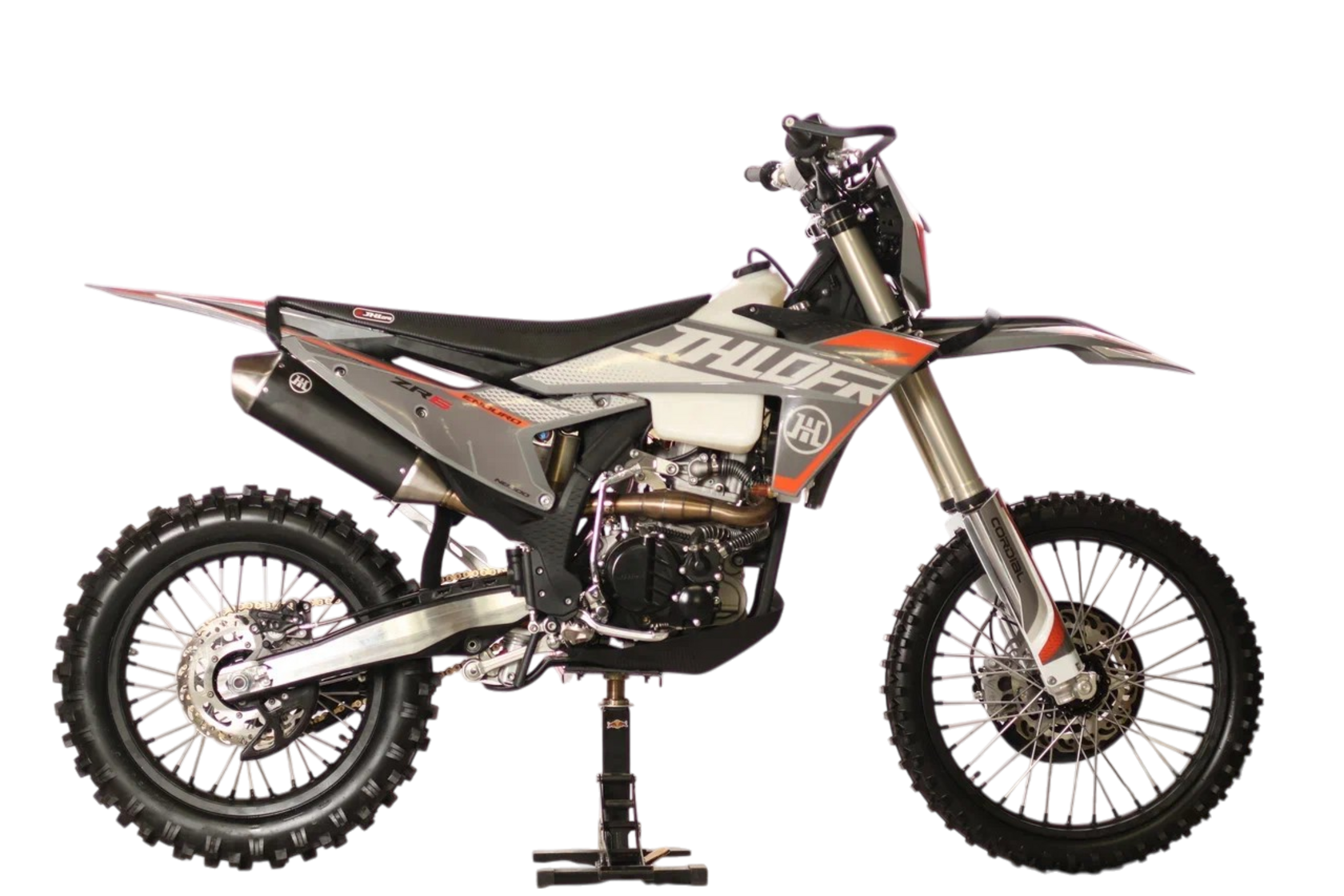JHLofr ZR6 NB300 (174MN-3) – мотоцикл-эндуро премиум-класса. Быстрый, надежный, основные моменты полностью аналогичны продукции австрийского концерна KTM AG. Как все машины такого класса, предназначен для приключений на необорудованных трассах, участия в соревнованиях. Но производитель очень творчески подошел к созданию байка, учел не только технические моменты, но и безопасность гонщика.Фишки байка JHLofr ZR6 NB300 (174MN-3) в обзоре от JHlmoto:легендарный мотор 174-й серии с достаточной мощностью и крутящим моментом. Ему по плечу любые неожиданности и препятствия на трассе;толщина спиц на колесах позволяет совершать прыжки без риска повредить диск или колесо в целом;тормозные диски защищены от попадания грязи, они не греются, выполнены в гоночной форме;мотоциклы этой серии оснащаются заводскими стропами, что позволяет быстро вытащить из грязи или поднять его после падения;гарды на руле – считаются фишкой этой серии – защищают не только руки гонщика, но прочие приборы, которые установлены на машине;звезда – композитная (из алюминия и стали), что существенно снижает вес конструкции;колеса – с завода они приходят с кроссовыми покрышками, но переобуть железного коня для опытного гонщика не проблема;все провода фиксируются водоотталкивающими зажимами, не болтаются. Кроме того, они правильной длины, не возвышаются горбом перед лицом гонщика. Но при этом ее достаточно для корректного управления машиной.Как у прочих продуктов этого производителя, все разъемы аккумулятора, электрической части байка упакованы в водоотталкивающие кожухи. Поэтому соревнования проводятся в любую погоду, а гонщик занимается любимым видом спорта круглый год. Байк без проблем выдерживает колебания температур на наших широтах.N