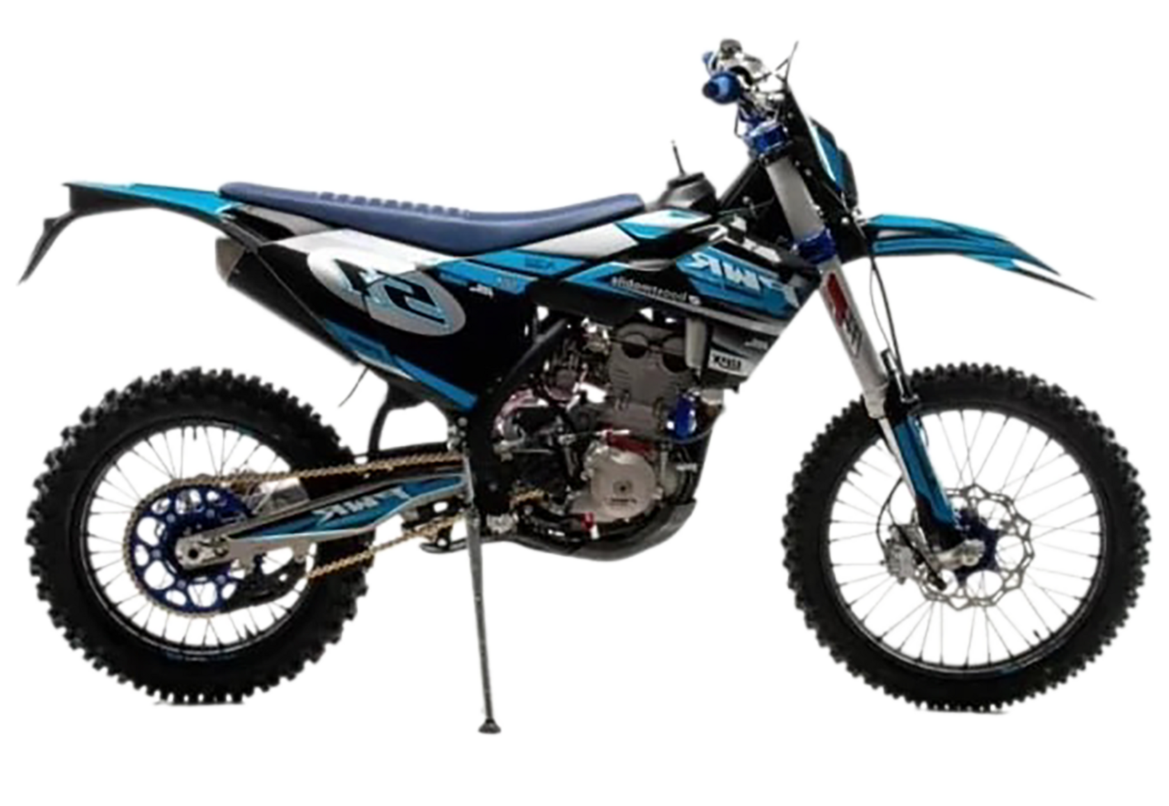 Топовый мотоцикл линейки PWR выглядит соответствующе — стильно и солидно. Без лишнего пафоса, но с уверенностью в собственном превосходстве над аналогами. Как и другие модели PWR, кроссовq 450 кубовый мотоцикл покрыт комбинированным пластиком, который не ломается при сгибании. Все стыки идеально подогнаны, наклейки ровные. Кроссовый мотоцикл доступен в синем цвете — внешний вид кросса подчёркивает несгибаемый характер и нацеленность на бескомпромиссную спортивную борьбу. Длина FS450 NC — 2160 мм, высота по седлу — 960 мм. Хорошее соотношение, которое подойдёт большинству пользователей среднего и большого роста.На кроссовый мотоцикл установлен руль переменного сечения (28 мм в месте крепления и 22 мм на концах под грипсами) с низким подъёмом и с подушкой IGP.