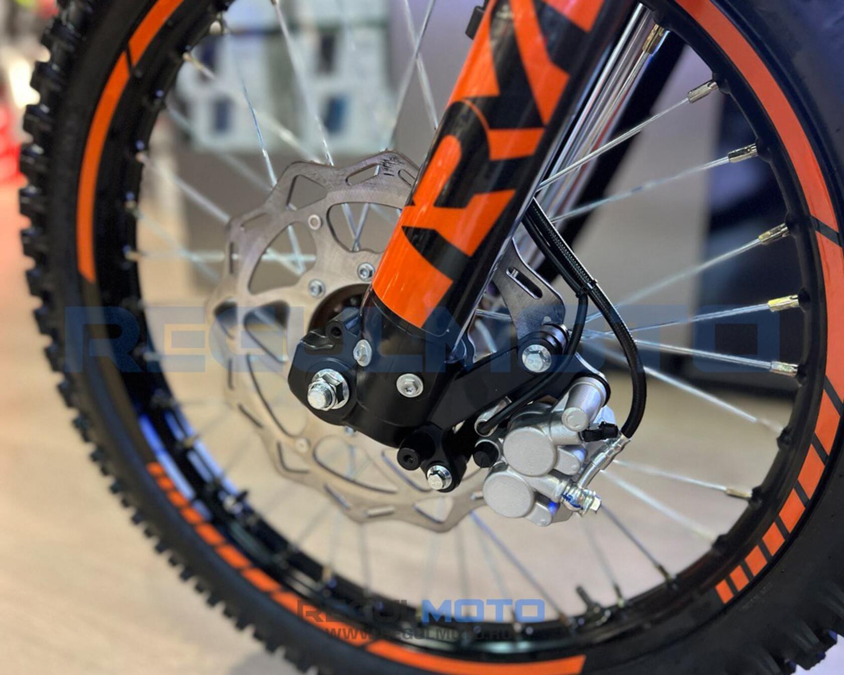 Regulmoto ZR PR Enduro 2024г. 4 клапана на цилиндр с балансирным валом«Regulmoto» представляет вниманию поклонников фри-райда мотоцикл Regulmoto ZR 4 valves. Стильный и доступный байк многоцелевого назначения найдет применение в качестве надежного аппарата для покорения бездорожья, а также может использоваться для решения широкого круга утилитарных задач и передвижения по дорогам общего пользования.В основе конструкции Regulmoto ZR 4 valves – мощная стальная рама, поставленная на колеса 21/18, которые наилучшим образом подготовлены к офф-роаду. Ободья и ступицы колес изготовлены из алюминия, также установлены усиленные спицы и буксаторы, надежно фиксирующие покрышки на ободе. Подвеску эндуро-байка представляют длинноходная телескопическая вилка-«перевертыш» спереди и стальной маятник с прогрессией и моноамортизатор с компенсационным резервуаром сзади. Работу амортизаторов при необходимости можно настроить при помощи регулировки сжатия/отбоя.Силовая установка мотоцикла представлена одноцилиндровым 4-тактным двигателем Zongshen ZS175FMM-7 с воздушным охлаждением рабочим объемом __ см3 с балансировочным валом 4-мя клапанами; за подготовку топливной смеси отвечает карбюратор Nibbi PE30. Технический потенциал надежного и производительного двигателя позволяет демонстрировать __лошадиную силу максимальной мощности и максимального крутящего момента.Regulmoto ZR PR 4 valves также привлекает внимание отличными внешними данными: мотоцикл комплектуется крепким и гибким пластиком с ярким дизайном, выполненным в узнаваемой стилистике популярной модели известного производителя. Подбор качественных компонентов также заслуживает внимания:• электронная приборная панель;