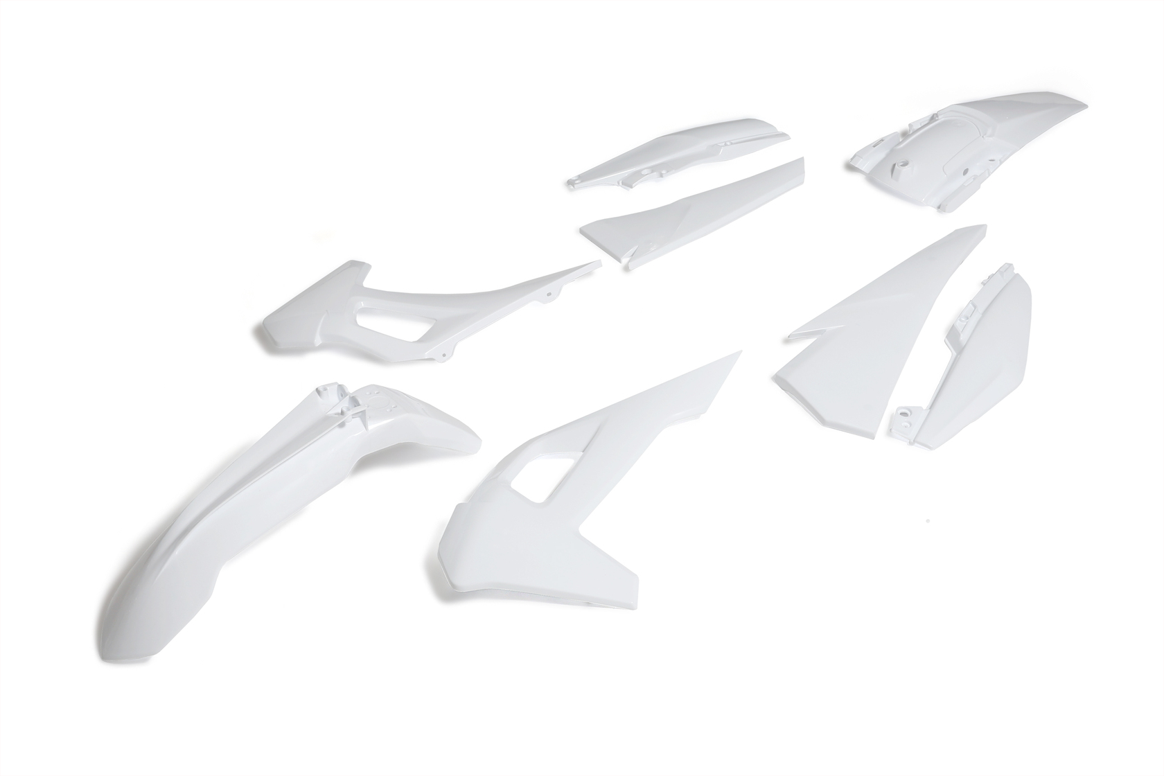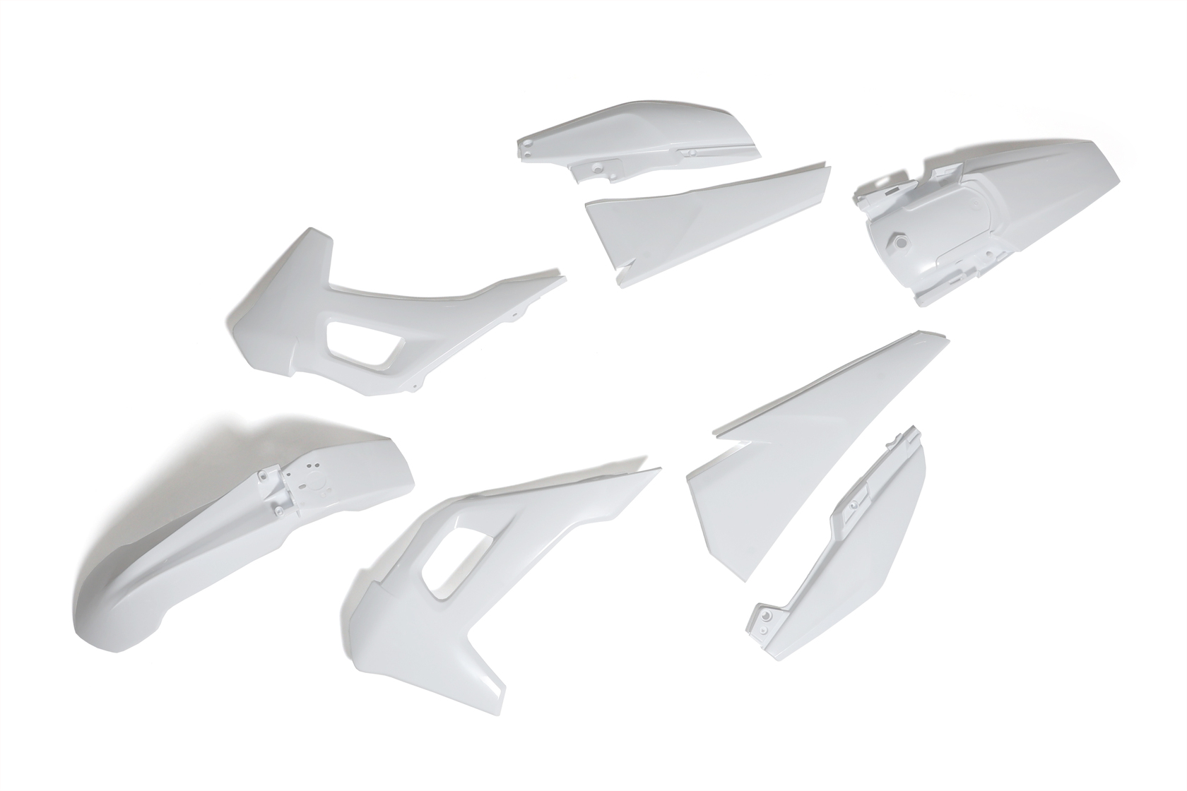 Комплект пластика для BRZ H6, белый цвет. Дизайн выполнен в стиле Husqvarna, что придаёт мотоциклу современный и узнаваемый внешний вид. Комплект не имеет аналогов — является уникальной разработкой для данной модели, идеально подгоняется по геометрии и креплениям к раме BRZ H6. Пластик высокопрочный, устойчив к ударам, ультрафиолету и истиранию, рассчитан на эксплуатацию в самых разных условиях (эндуро, мотокросс, экстремальные поездки).