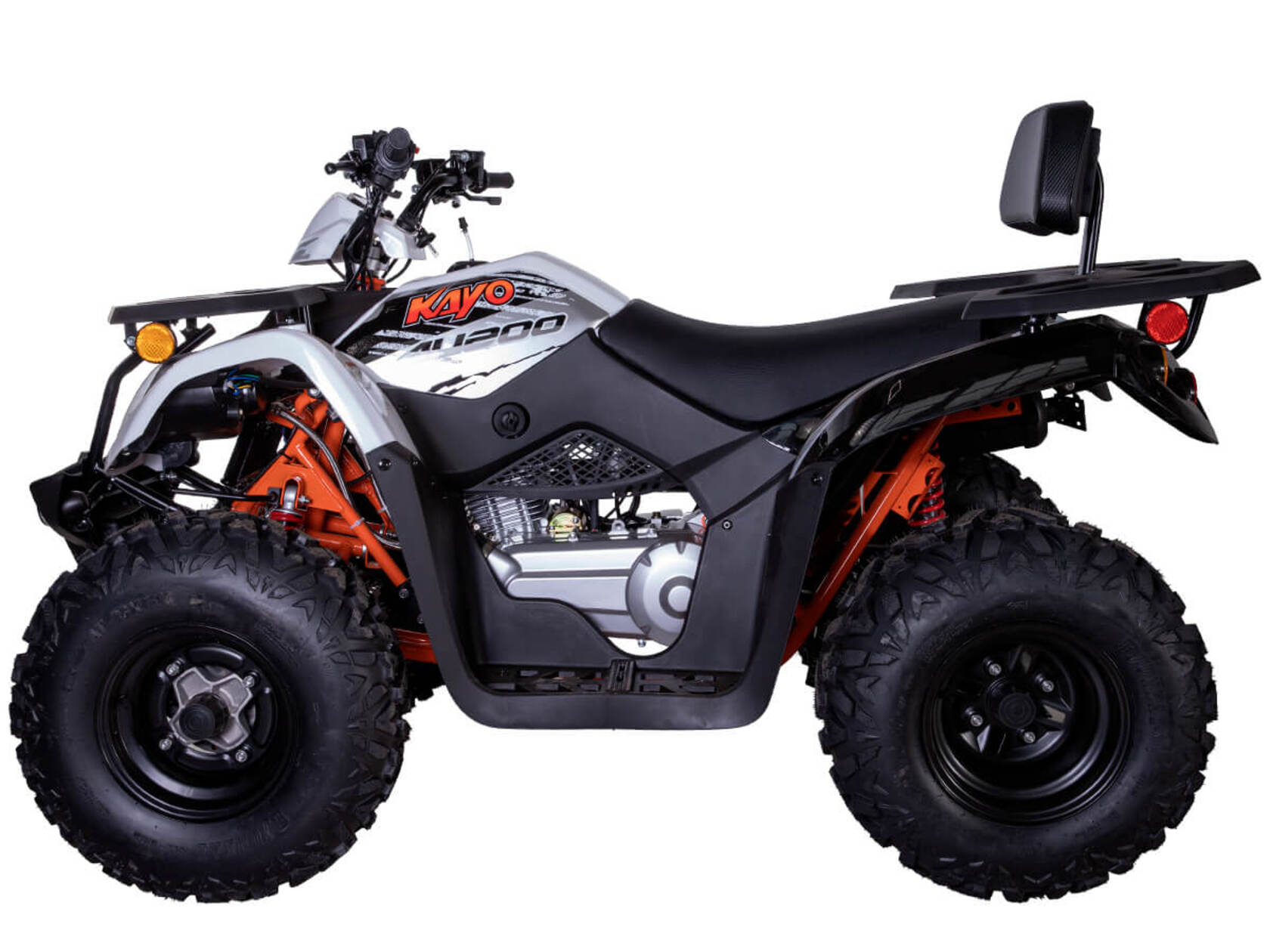 KAYO AU200 в модификации 2024 года - популярная и доступная модель квадрицикла, которая пользуется вниманием широкого круга любителей внедорожных приключений и активного отдыха. Небольшой утилитарный мотовездеход обладает незаурядными возможностями практического использования и рассчитан на людей разного возраста и опыта.В крепкой раме квадрицикла, проверенной годами и тысячами пользователей, установлен 4-тактный мотор с вертикальным расположением цилиндра. Рабочий объем двигателя в 176 кубических сантиметров позволяет развивать максимальную мощность в 13 лошадиных сил. Данный мотор оснащается балансирным валом, что способствует снижению вибраций и положительно сказывается на комфорте передвижения.У KAYO AU200 используется автоматическая трансмиссия на базе вариатора. Рычаг селектора передач имеет три положения: задний ход – нейтраль – вперед. На крышке вариатора установлен шноркель, и его воздухозаборное отверстие расположено довольно высоко. Это дает возможность преодолевать небольшие водные препятствия, не опасаясь попадания воды в трансмиссию.Все кнопки управления оборудованием собраны в один компактный пульт. Здесь находятся кнопки запуска и остановки двигателя, переключатели светового оборудования, кнопка звукового сигнала. Для удобства запуска двигателя рычаг подсоса также вынесен на руль. Как и любой другой утилитарный квадрицикл, KAYO AU200 комплектуется задним и передним багажниками, сделаными из стальных труб и облицованных пластиком.Внимание данный товар поставляется в разобранном виде, в коробке для самостоятельной сборки.