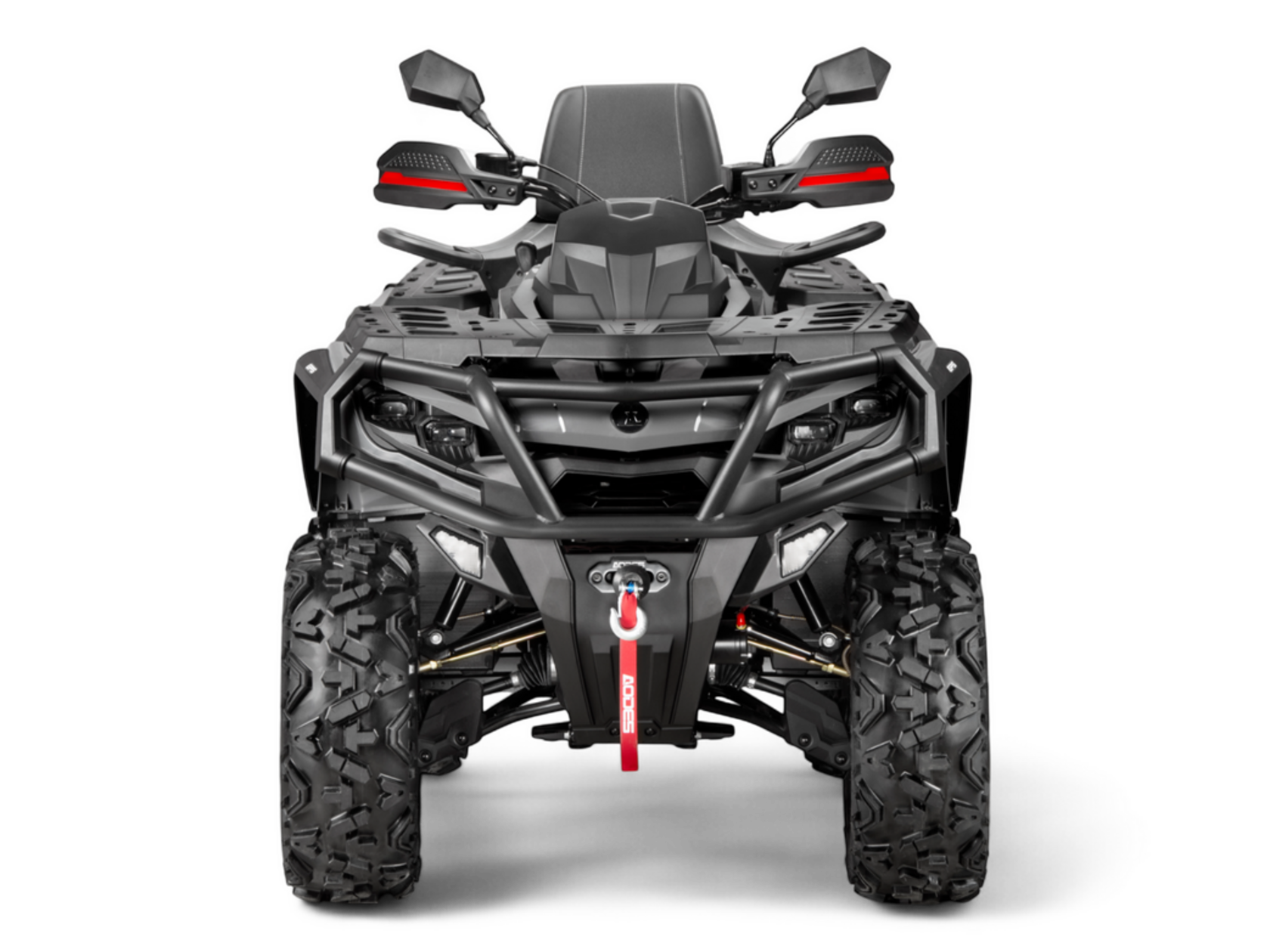 Комплектация Комбинация приборов Электронный ключ зажигания, LCD приборная панель 6,86 дюйма с индикацией основных параметров: вкл/выкл полного привода, индикацией уровня топлива, сигналов поворота и аварийной остановки, подсветки, переключение режимов усилителя руля, информация о техническом обслуживании. Лебедка Лебедка с синтетическим тросом и тросоукладчиком, тяговое усилие 1500 кг Элементы защиты Ветрозащита рук на руле, расширители колесных арок, передний и задний бампер, замок блокировки рулевого вала Дополнительное оборудование Электроусилитель руля, cветодиодная оптика, дополнительный свет, фаркоп с электроподготовкой, звуковой сигнал, сигналы поворота, зеркала заднего вида, бардачок объемом 2 литра под сиденьем, алюминиевые подножки водителя, эргономичная задняя и передняя багажные площадки, розетка 12 Вольт и USB.