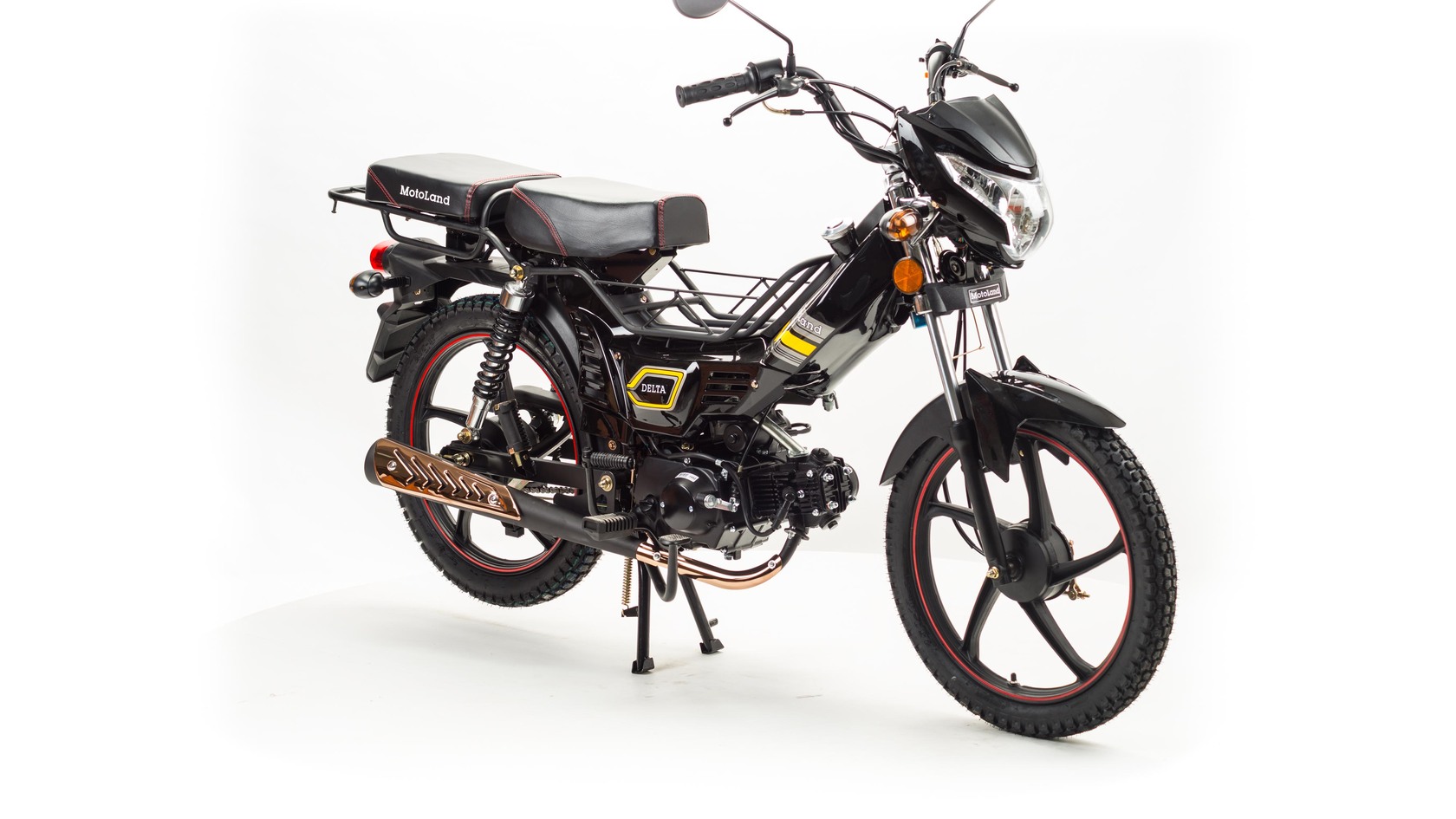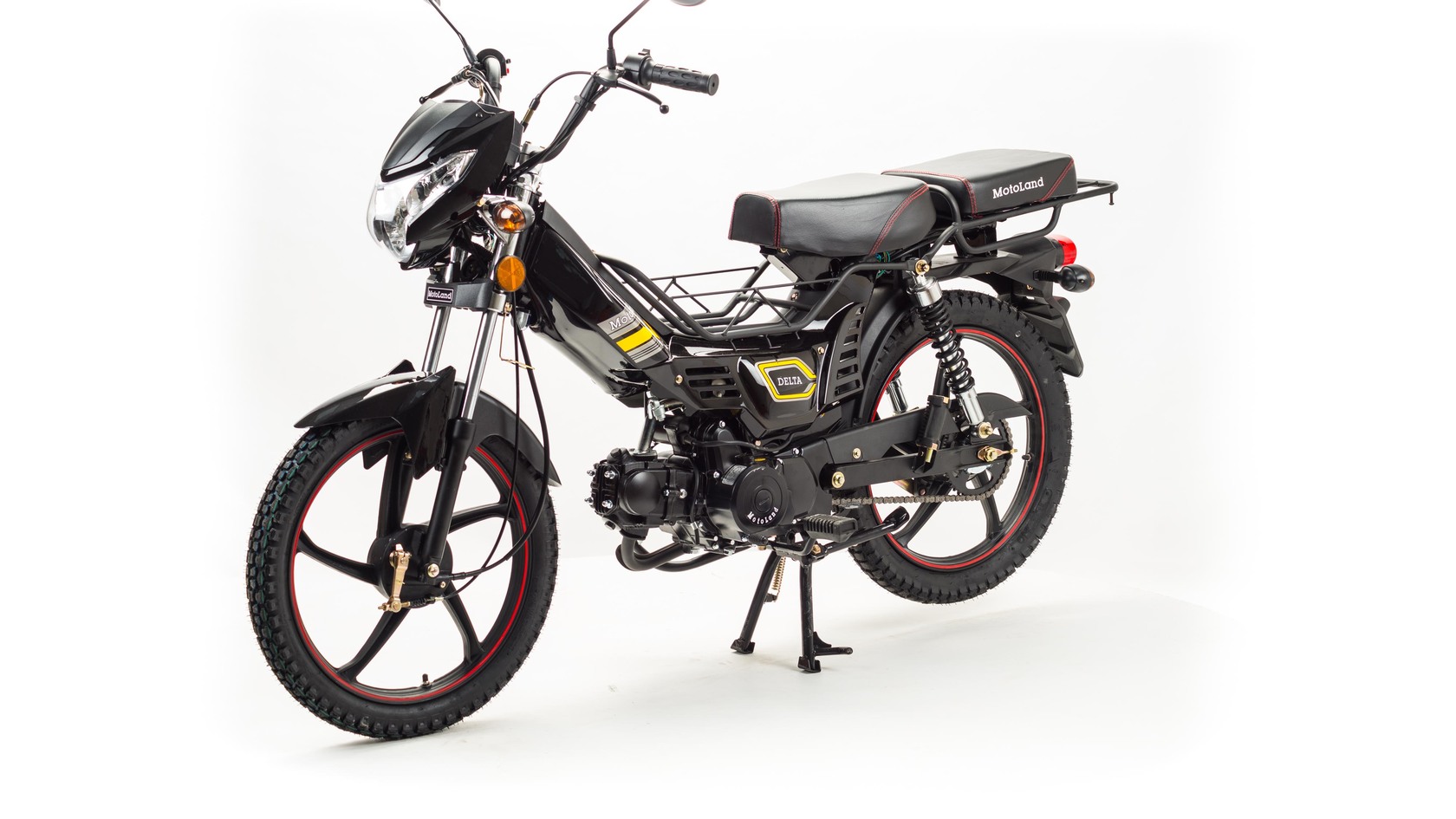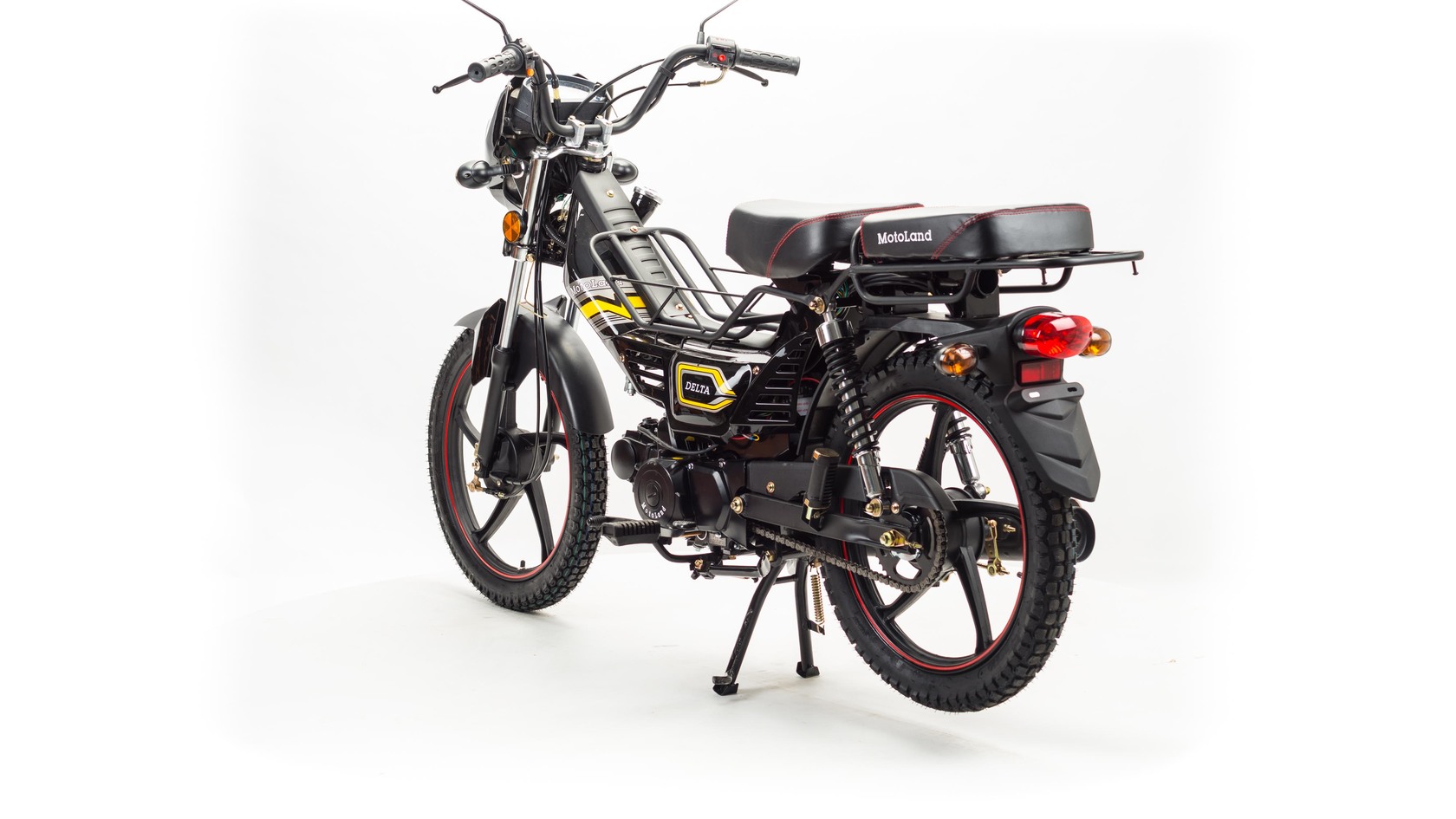 Мопед Motoland Дельта это всеми полюбившейся мопед который хорошо зарекомендовал себя на отечественном рынке. Выпускается в трех цветах: красный, синий, черныйМопед можно использовать для самых различных целей: для одиночного или совместного передвижения в городском потоке, сельской местности, поездки на природу, рыбалку и охотуПри этом он универсален и подходит мотолюбителям любого возраста,и опыта вождения.Для подростков, подойдет как подарок и первый мотоцикл для только начинающего свое знакомство с миром мототехникиВзрослых, которым нужна техника для поездок из точки А в точку Б и обратно, именно в таком режиме он способен показать себя с лучшей стороны.Мопед полностью отвечает требованиям к безопасному движению по городу и за городом: оснащен фарой дальнего и ближнего света, поворотниками, стоп-сигналом, звуковым сигналом, зеркалами заднего вида, габаритными светоотражателямиДля того чтобы ездить на мопеде, нет необходимости в регистрации в ГИБДД и страховке.Техническая сторонаМопед поставляется с 50 кубовым одноцилиндровым четырехтактным двигателем с воздушным охлаждением ZS50-A (1P39FMB).Установлен карбюратор PZ 19.Двигатель работает ровно, имеет высокую мощность в широком диапазоне оборотов, что позволяет комфортно трогаться и быть уверенным, что двигатель не заглохнет в неподходящий момент.Двигатель имеет возможность легкого запуска с кнопки на руле, так как имеет электростартер, а при необходимости можно воспользоваться кикстартером.Механическая трансмиссия содержит 4 передачиПри покупке мопеда, в подарок мы даем улучшенную поршневую.Мопед имеет хорошую динамику разгона, расход 1.6 л на 100 км, объем бака 3л, которого хватит на 200+кмПередняя подвеска телескопическая, с защитной гофрой.Задняя подвеска состоит из двух гидравлических амортизаторов, с прогрессивной пружинойВес мопеда 80 кг, выдерживает нагрузку до 150 кг.Колесные диски алюминиевые, размер колес — 17 дюймов (430 мм).Барабанные тормоза установлены на переднем и заднем колесе.На передней электромеханической приборной панели расположены спидометр,тахометр а также датчик включенной скорости