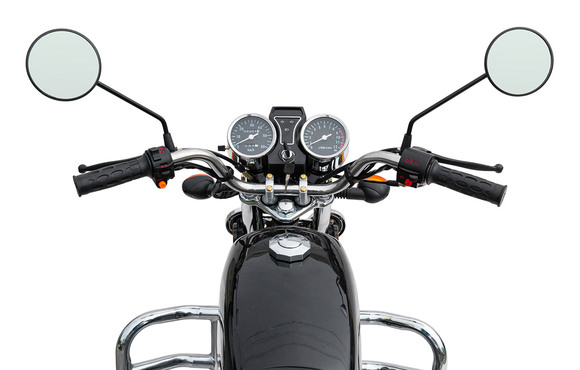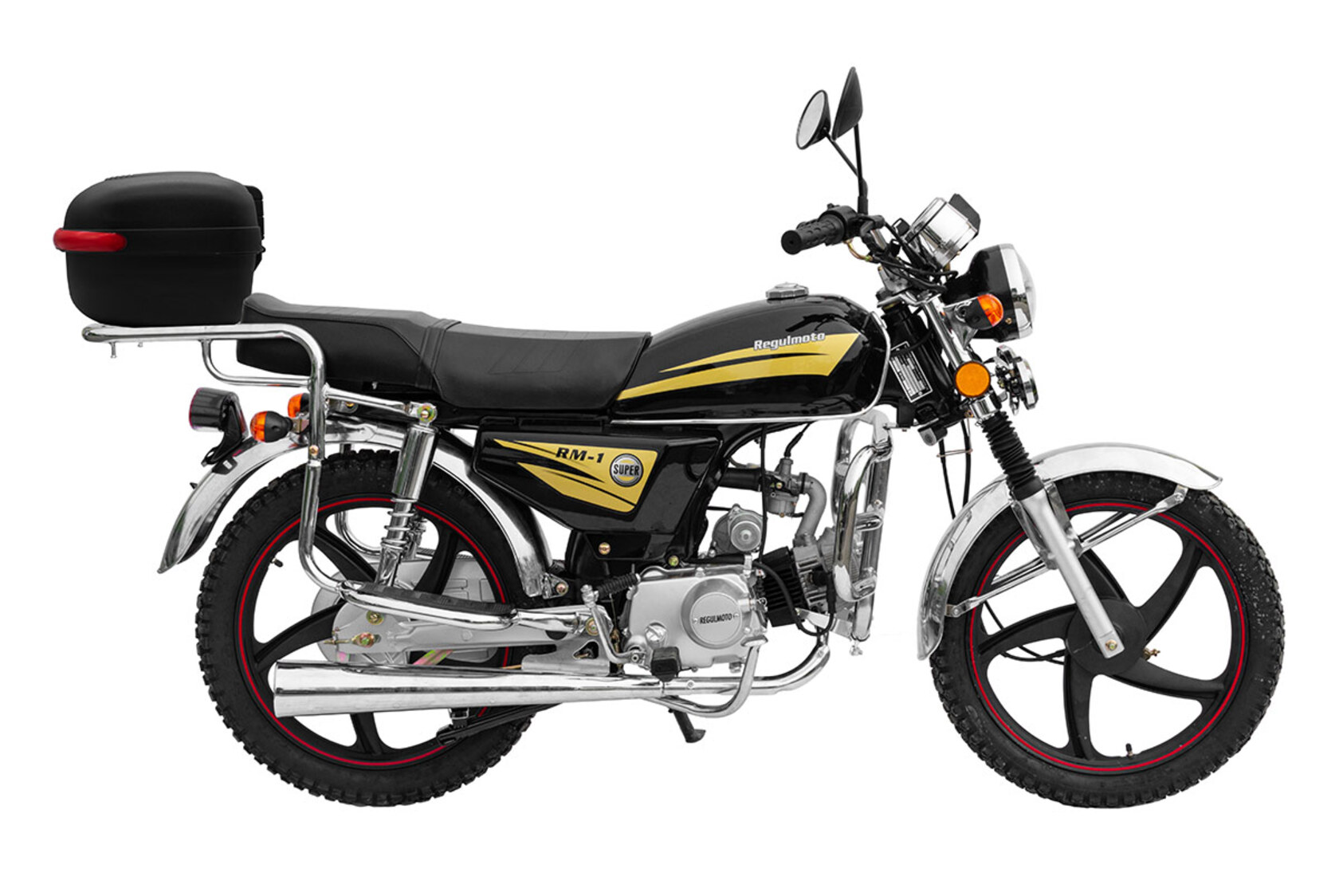 Комплектация Тормозная система – два барабанных тормоза. Усиленные тросы переднего тормоза и сцепления. Кроме того, на Regulmoto Alpha (RM-1) установлены зеркала заднего вида, подножки для пассажира, багажный кофр, кожух защиты цепи и дуги безопасности.