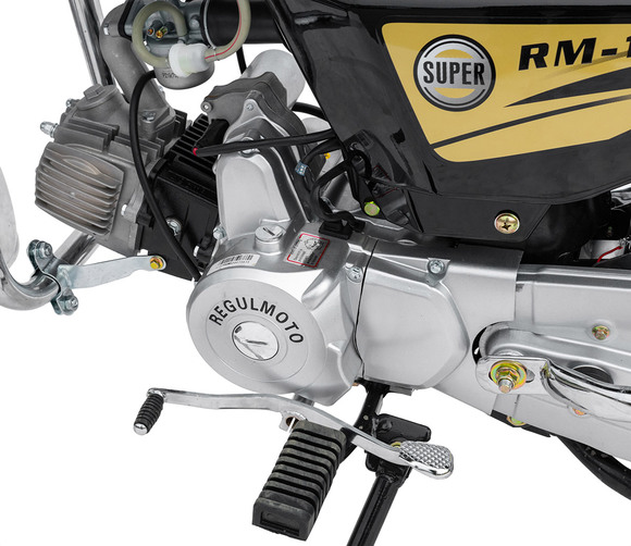 Regulmoto Alpha (RM-1) 110сс – «живая классика» китайской мотоиндустрии, один из самых доступных представителей двухколесного транспорта утилитарного назначения. Новое поколение Alpha готово продемонстрировать улучшенные показатели производительности, высокую надежность в повседневной эксплуатации и традиционную неприхотливость в сервисном обслуживании. Данный мопед комплектуется надежным «кабовским» двигателем – одноцилиндровым 4-тактником воздушного охлаждения с 4-ступенчатой трансмиссией. Рабочий объем мотора увеличен до 110 см3 благодаря установке нового комплекта ЦПГ на заводе-изготовителе. Запуск двигателя возможно осуществить как при помощи кнопки электрострартера, так и при помощи рычага традиционного кик-стартера. Увеличение рабочего объема мотора заметно сказывается как на максимальной развиваемой мощности, которая составляет чуть больше семи лошадиных сил, так и на эксплуатационных характеристиках техники.Среди других усовершенствований комплектации обновленного Regulmoto Alpha (RM-1) следует отметить более мощные передние амортизаторы (диаметр до 28 миллиметров), усиленные тросы переднего тормоза и сцепления, современную светодиодную лампу в фаре головного света. Кроме того, на Regulmoto Alpha (RM-1) установлен полный комплект светотехники, зеркала заднего вида, аналоговая приборная панель, на которой отображаются пробег, скорость, выбранная передача, обороты двигателя, индикаторы работы поворотников и фары. Также имеются подножки для пассажира, багажный кофр, кожух защиты цепи и дуги безопасности.Владелец новенького Regulmoto Alpha (RM-1) по достоинству оценит экономичный двигатель, высокую надежность конструктивных решений и доступную стоимость сервисного обслуживания техники. Мопед полностью готов к комфортному использованию на дорогах города и проселках пригорода и способен успешно справляться с широким кругом эксплуатационных задач.