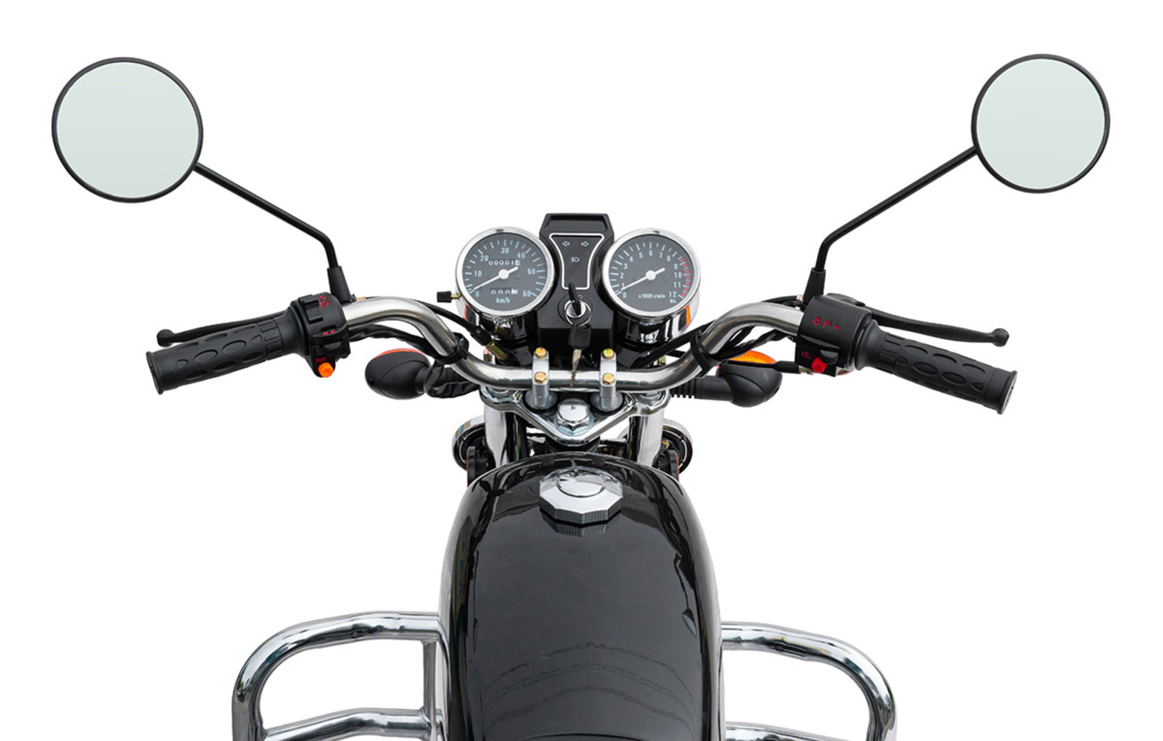 Электрика Светодиодная фара, электростартер, замок зажигания, АКБ(12В, 4Ач), полный комплект светотехники, аналоговая приборная панель.