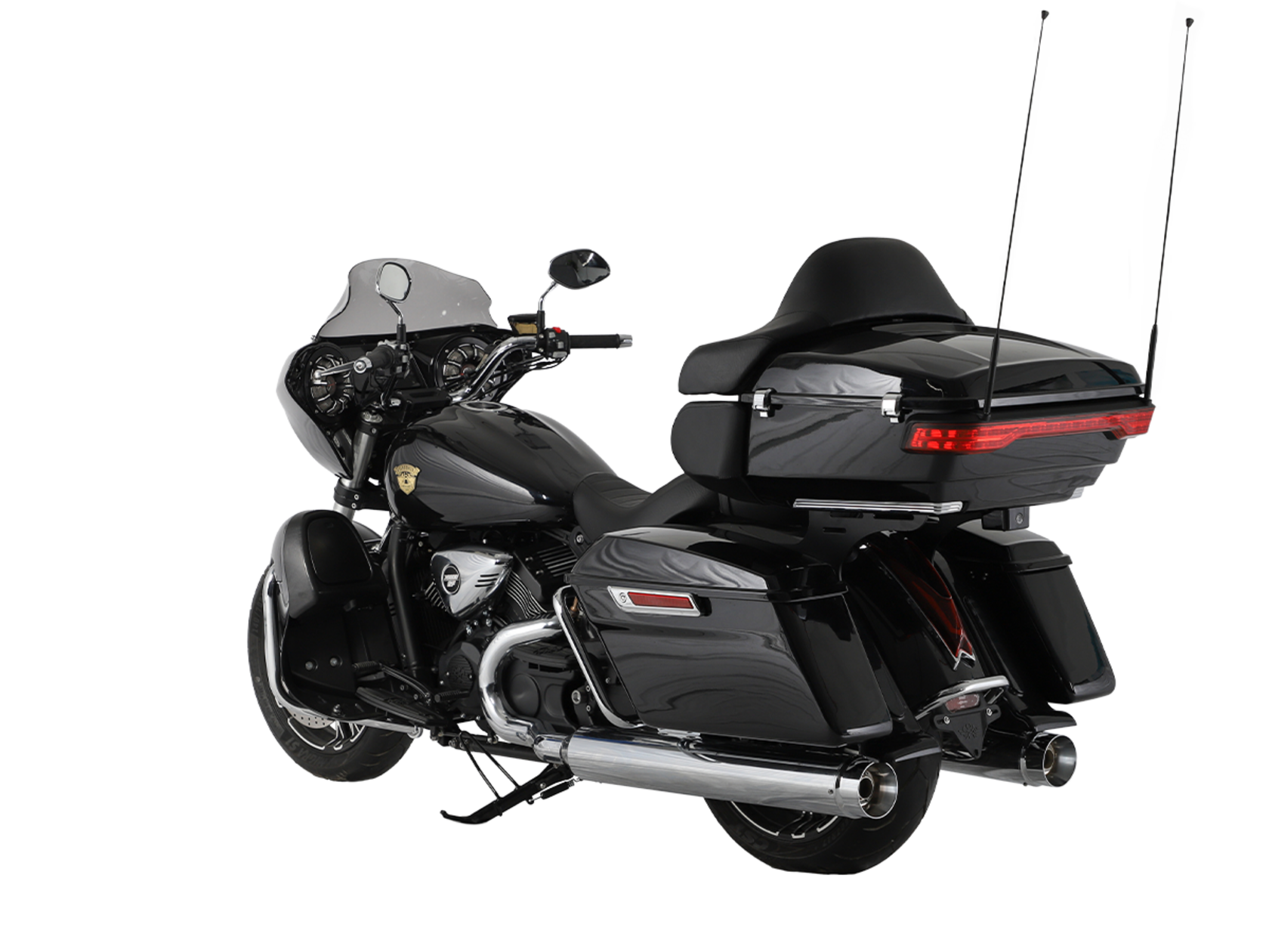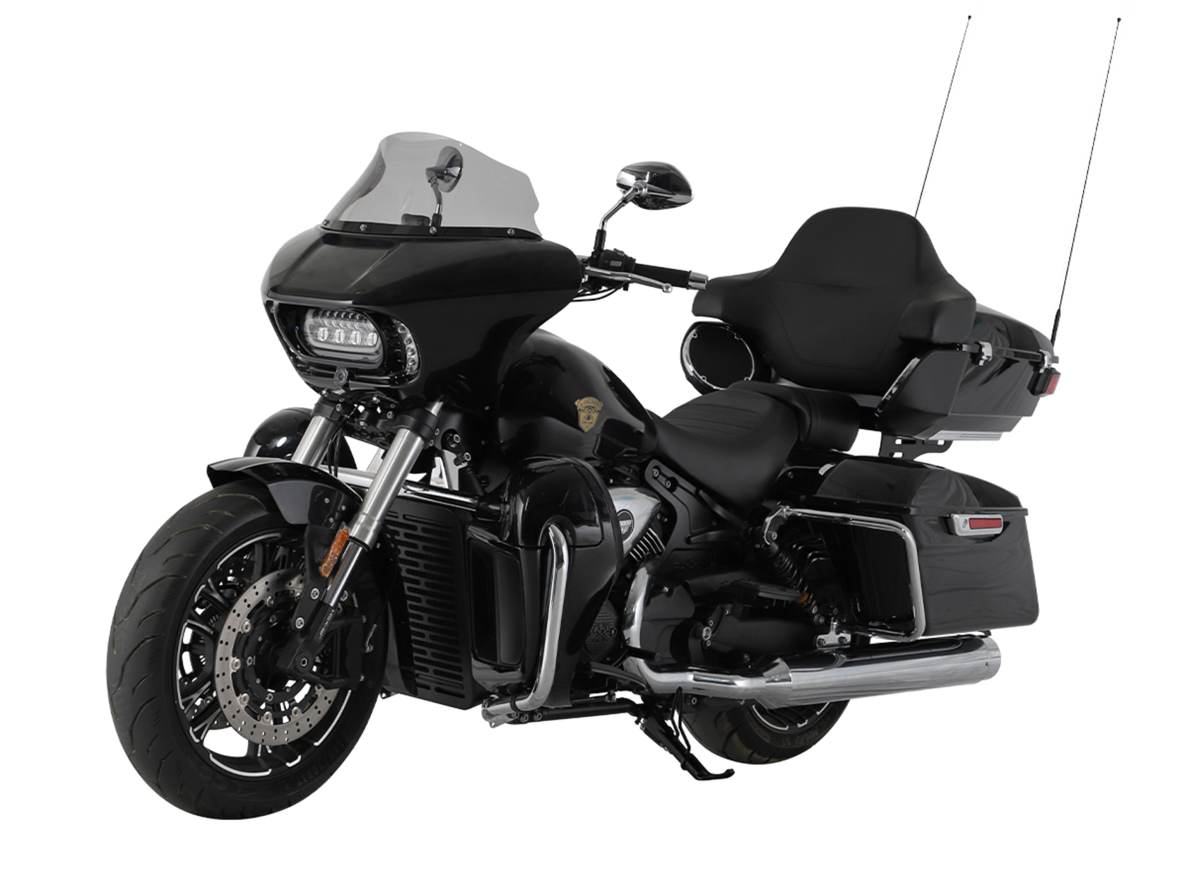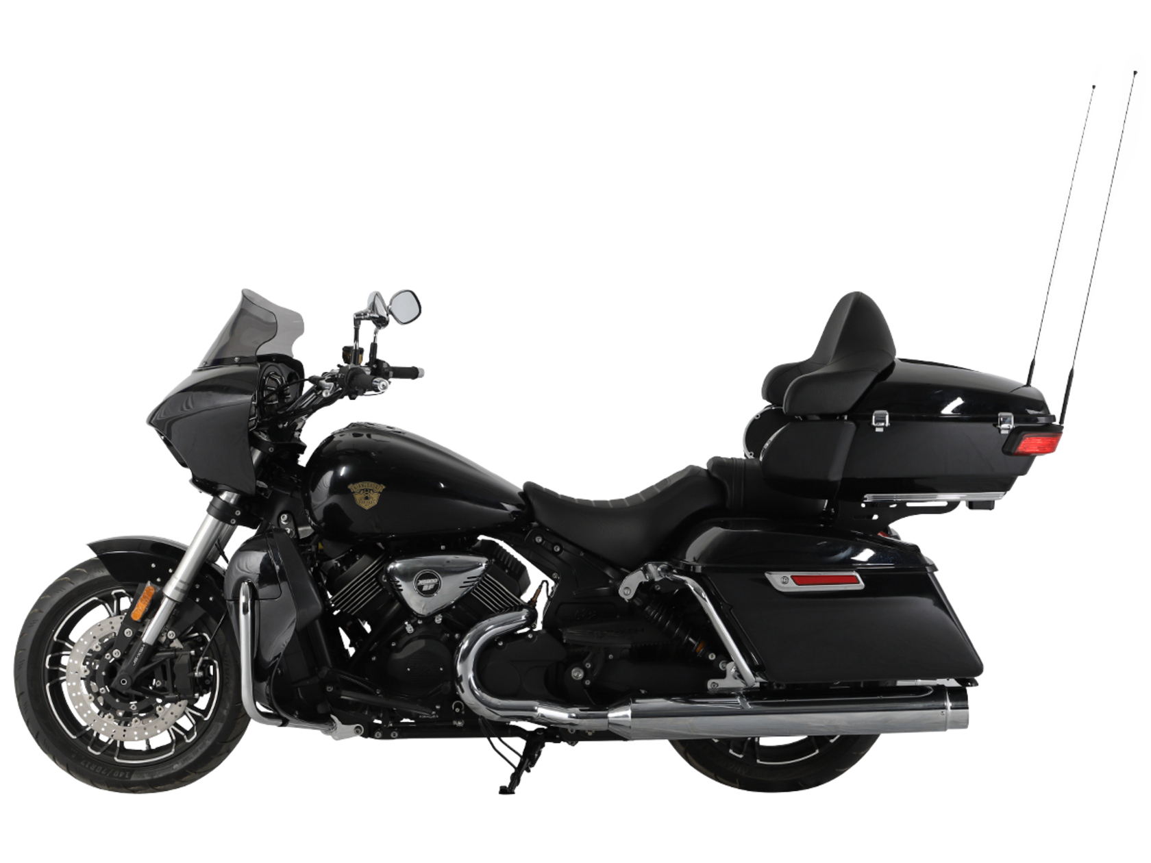 GROZA Traveller 800 – роскошный круизёр, который создан для суперкомфортного перемещения на любые расстояния. Он имеет современный, брутальный дизайн с мощным обтекателем, характерной светодиодной головной оптикой и монументальными хромированными глушителями.Двухцилиндровый V-образный двигатель объёмом 800 см3 мощностью 61 л.с. при высоких показателях динамики и отличном крутящем моменте способен разгонять аппарат до 160 км/ч. Привод на ведущее колесо осуществляется ремнём знаменитой марки USA Gates. Жидкостная система охлаждения не допустит перегрева мотора даже на самых непростых маршрутах.На мотоцикл установлены литые алюминиевые диски диаметром 17 дюймов. Ширина передней покрышки – 140 мм, задней – 200 мм. С неровностями дороги эффективно справляются телескопическая вилка перевёрнутого типа спереди и маятник с двумя амортизаторами сзади. Вилка имеет 7 ступеней регулировки, что обеспечивает лёгкую перестройку на различные режимы езды. Для всего класса круизёров такая опция – большая редкость. Эффективное и безопасное замедление с любых скоростей обеспечивают гидравлические дисковые тормоза спереди и сзади от компании NISSIN.Мотоцикл оснащён мощной музыкальной системой с четырьмя 6,5-дюймовыми динамиками, двумя штатными видеорегистраторами спереди и сзади, тремя грузовыми кофрами общим объёмом 120 литров, развитой спинкой для пассажира, массивными дугами и “валенками”, снабжёнными открывающимися вентиляционными шторками и небольшими грузовыми ёмкостями. Из других приятных мелочей в допоборудовании мотоцикла стоит выделить подогрев ручек, датчики давления в шинах и USB-порт.Мотоцикл сочетает в себе отличные технические характеристики, богатое оснащение, комфорт и надёжность, что позволяет вам ощутить настоящую свободу, отправившись на нём в любое путешествие.
