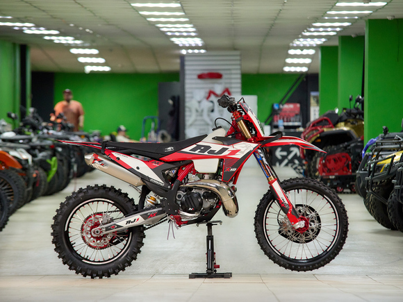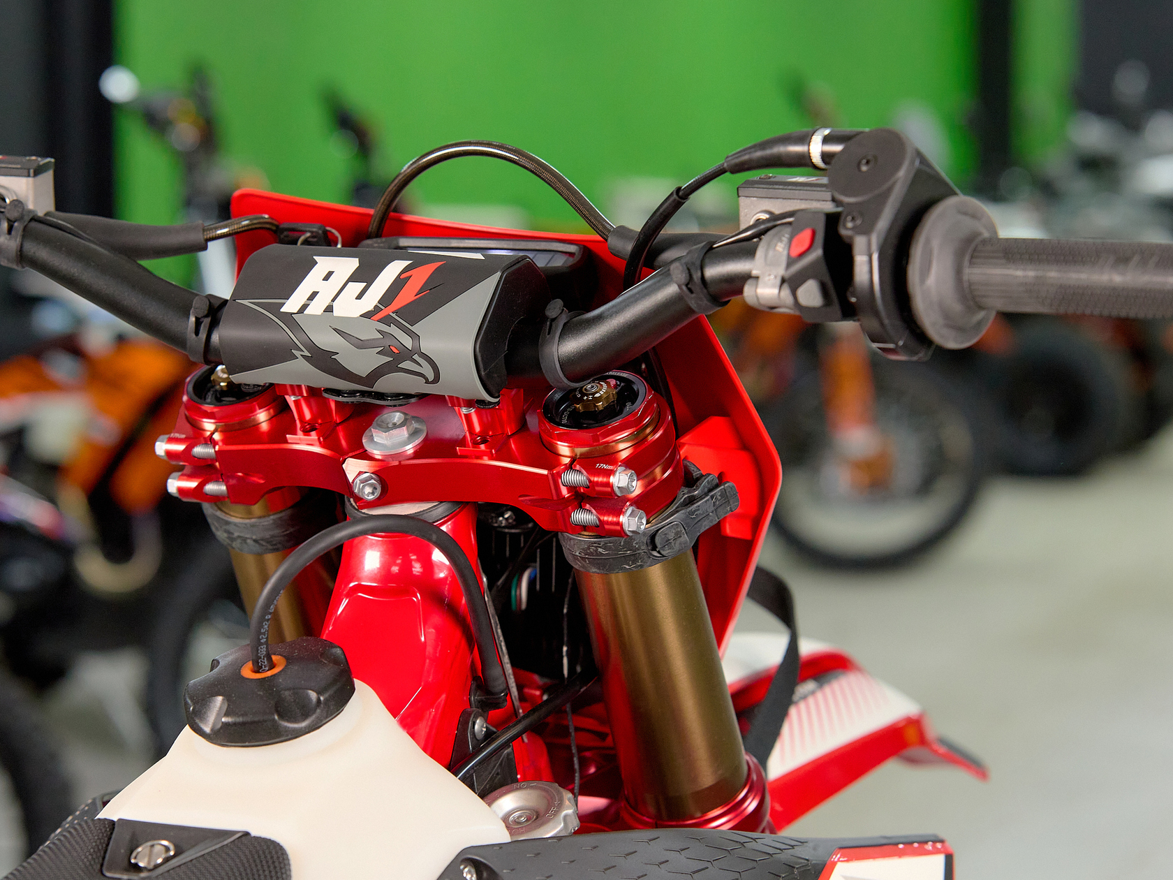 Подробнее о AX300Модифицированная подвеска разработанная AJ1 совместно с HTW, регулировать которую можно теперь без применения инструментов, «на ходу». Двухкамерная передняя вилка с закрытым картриджем (DCC) серии AJ1-T10 с диаметром пера 48 мм и длиной 940 мм, в которой используются двукомпонентные сальники SKF Италия, а также высококачественные направляющие от японской фирмы DID ЯпонияМоноамортизатором HTW T10 регулировка без инструмента с системой PDSНовые фрезерованные траверсы со всеми регулировками а также руль переменного сечением из высокопрочного алюминиевого сплава марки 7075-T6.Новая запатентованная конструкция воздушного фильтра AJ1-Pro Red. Предварительно пропитанный смазкой - фильтр специально создан для обеспечения максимального потока воздуха, сделанный из негорючего материала.Новые радиаторы и дефлекторы воздуха позволили повысить набегающий поток и улучшить охлаждение при движении.Широкие фрезерованные подножки AJ1 из алюминиевого сплава, со сменными шипами из нержавеющей стали.Обода из алюминия 7050-T6 в стандартной комплектации имеют подшипники NSK, 4-мм спицы из нержавеющей стали и алюминиевыми ниппелями в сочетании с новыми шинами AJ1 soft compound обеспечивает постоянное сцепления колес в разных дорожных условиях.Размер колес: перед – 80/100-21 зад – 120/100-18Новый алюминиевый маятник без прогрессии + направлющими с низким коэффициентом трения обеспечивает лучший контроль и экономию веса, необходимую на треке и в горах.Запатентованная тормозная система AJ1 зарекомендовавшая себя, как лучшая в классе, великолепно работающая с тормозными дисками нового дизайн и синтетическими спеченными тормозными колодками Elig Тайвань. Спереди установлен двухпоршневой суппорт AJ1 в сочетании с диском диаметром 260 мм. Сзади – однопоршневой суппорт с диском диметром 220 ммВ стандартную комплектацию входит новая алюминиевая складывающаяся боковая подставку нового дизайна, а также фирменное сиденье AJ1Anti Skid, выполненным из нескользящего материала со специальными прорезиненными вставками.Ведомая звезда AJ1 520 на 52 зубаВыхлопная титановая система AJ1 с Power Bomb и DB-Killer (съёмный) легче на 1 кг предыдущих выхлопных систем от AJ1.