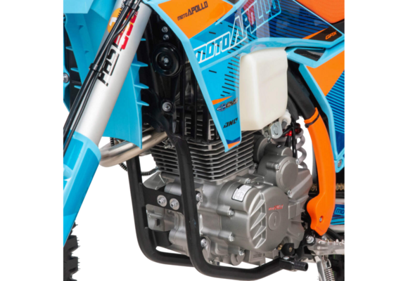 Moto Apollo F3 300 в этой версии — это сбалансированный кроссовый мотоцикл, разработанный для уверенной и динамичной езды по бездорожью. Несмотря на обозначение двигателя 175FMM, его реальный рабочий объём составляет 300 см³, а максимальная мощность — 25 лошадиных сил. Воздушное охлаждение, цепной привод ГРМ и отсутствие балансирного вала обеспечивают классическую кроссовую простоту конструкции, лёгкость обслуживания и высокую ремонтопригодность даже в полевых условиях.
