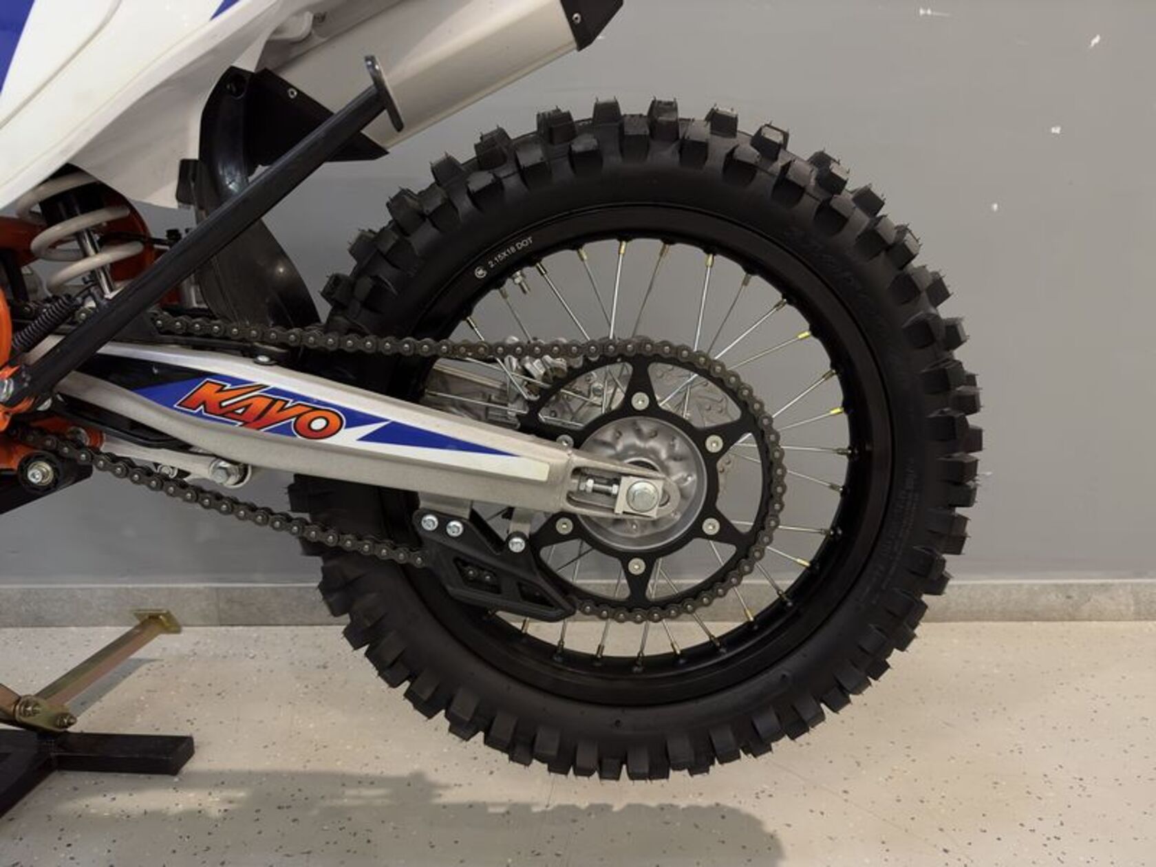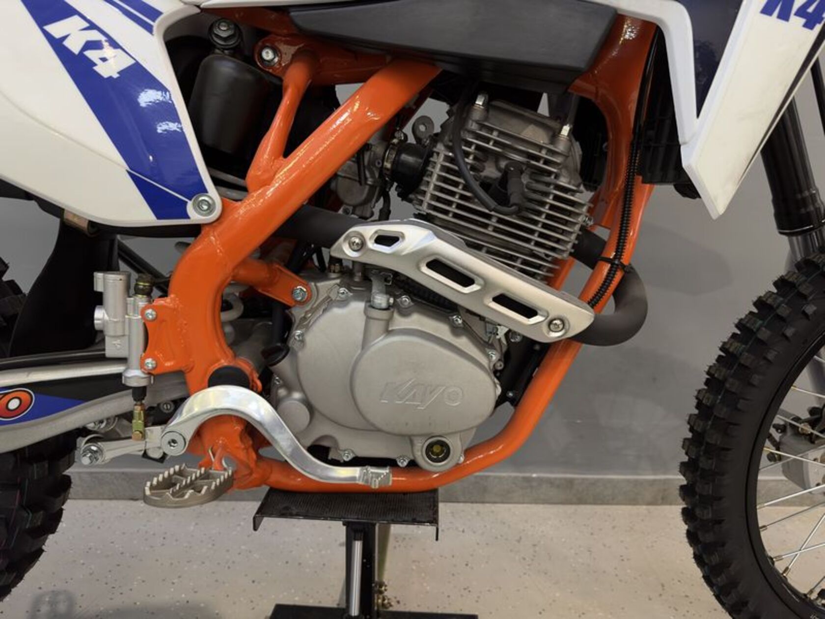 Мотоцикл кроссовый KAYO K4 MX - популярный внедорожный мотоцикл известного китайского производителя, завоевавший признание тысяч довольных владельцев. Обновленная версия отличается оптимально сбалансированной комплектацией и большими возможностями практического использования. KAYO K4 - это отличный выбор для райдеров с опытом, позволит совершенствовать навыки управления внедорожной мототехникой и получать весь спектр эмоций от поездок по бездорожью.В мощной раме KAYO K4 MX устанавливается надежный и неприхотливый 4-тактник воздушного охлаждения ZS172FMM с 5-ступенчатой коробкой передач. Этот мотор отличают отличная производительность и стабильные рабочие характеристики в широком диапазоне оборотов. Максимальная развиваемая мощность силовой установки, в тракте подготовки топлива которой задействован карбюратор NIBBI PE30, составляет 21 лошадиную силу.Подбор компонентов подвески мотоцикла продиктован условиями использования техники: длинноходные амортизаторы с регулировками рабочих характеристик установлены как в траверсах передней вилки перевернутого типа, так и на заднем маятнике с системой прогрессии. Алюминиевые диски колес размерности 21/18 дюймов оснащены буксаторами и комплектуются внедорожной резиной с выраженными грунтозацепами протектора.За безопасность эксплуатации отвечает надежная и производительная дисковая гидравлика тормозной системы: на переднем колесе установлен двухпоршневой тормозной суппорт, на заднем - однопоршневой. Высота по седлу KAYO K4 MX составляет 850 миллиметров - на байке с комфортом будут себя чувствовать как люди среднего роста, так и высокие райдеры.