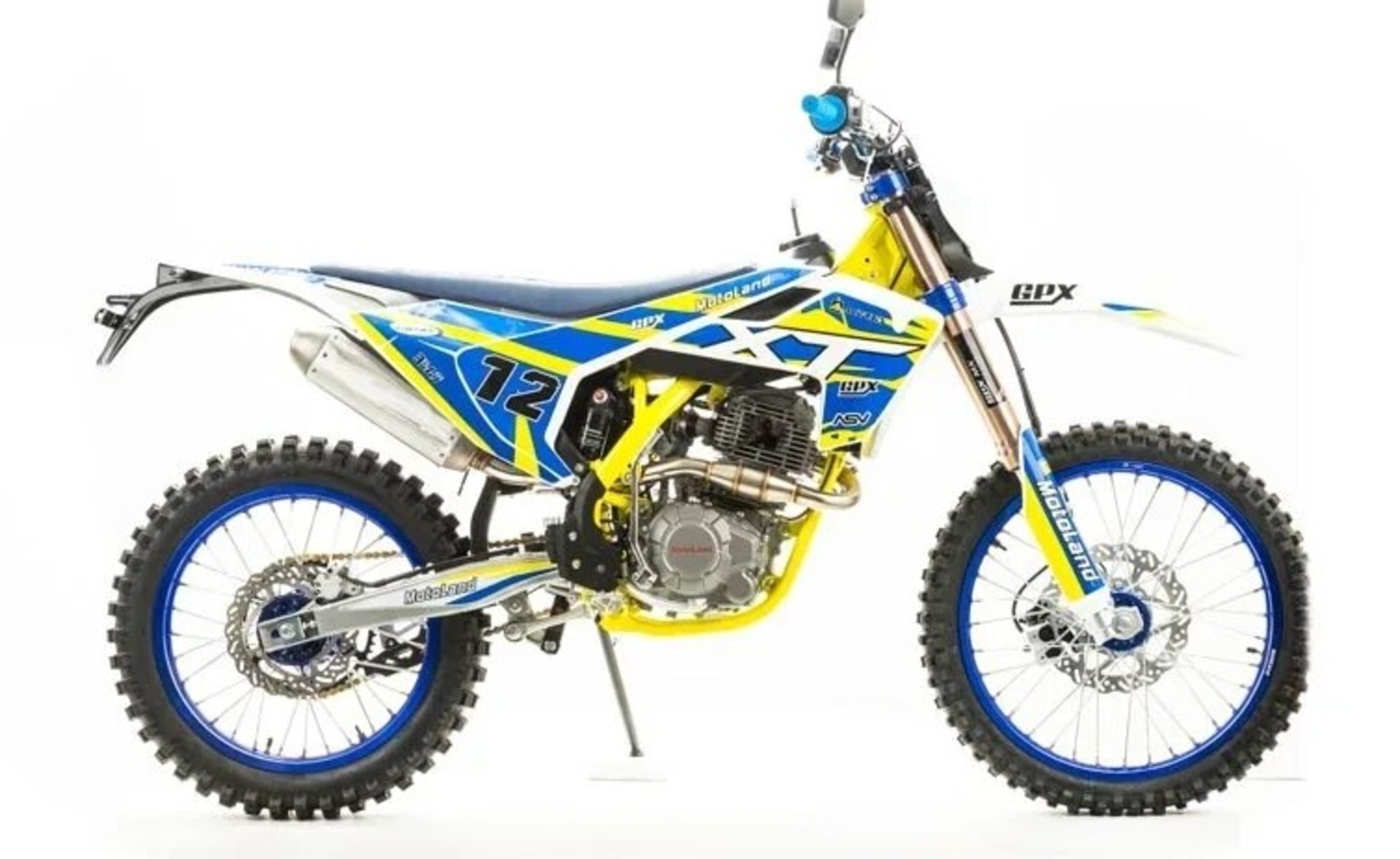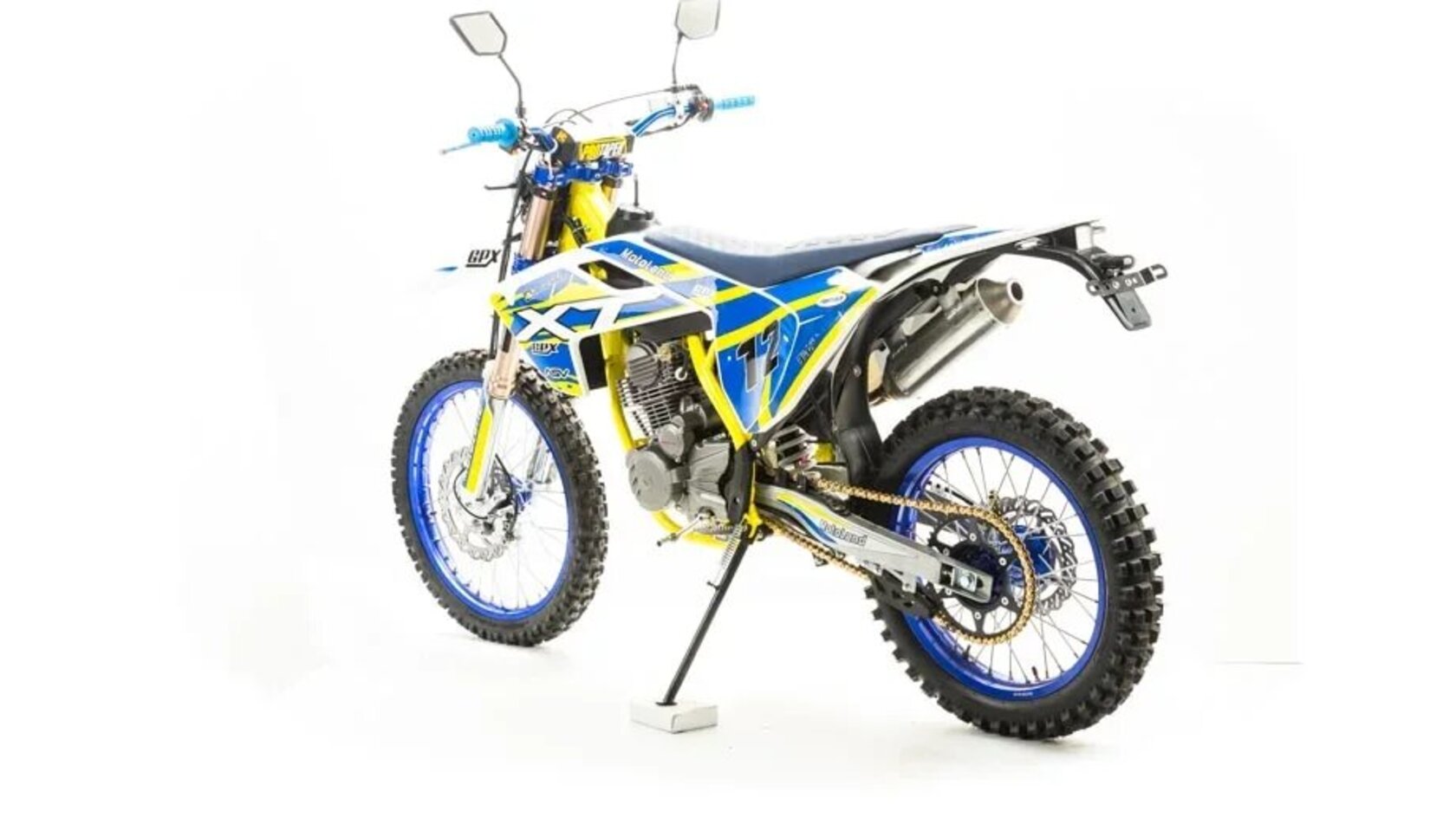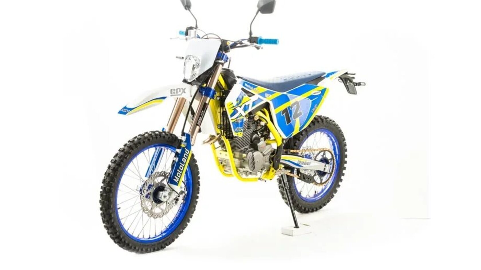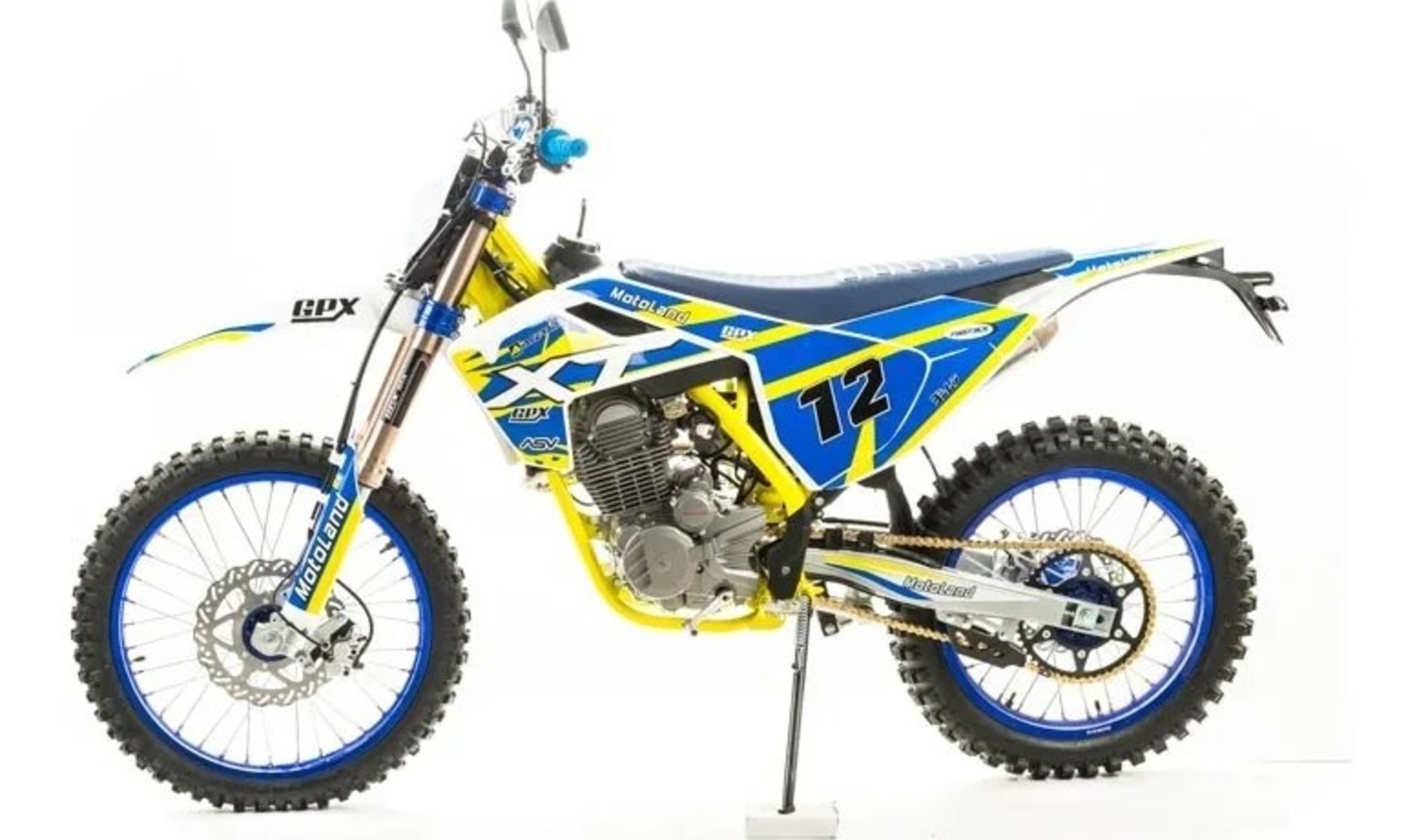 MOTOLAND XT250 ST (21/18)Современный дизайн мотоцикла напоминает очертания легендарной модели HUSQVARNA.Установлен самый мощный из двигателей с воздушным охлаждением ZONGSHEN 172FMM-3АБольшой ход подвесок для комфортного передвижения по пересеченной местности, которые также позволяют ехать быстро и агрессивноВысокий вынос руля которые позволяет комфортно ездить в стойке и полностью контролировать мотоциклКрепкая фрезерованная траверса с креплением стоек через резиновые уплотнения для амортизации руля.Мотоцикл больше предназначен для езды по переченной местности полям и лесам, чем для города из за профиля резины.Он маневренный и удобный,сидение с противоскользящим чехлом.При этом он прост в управлении и неприхотлив в обслуживании и подходит мотолюбителям любого возраста,и опыта вождения.Технические характеристикиАнтибуксаторы спереди и сзади для езды на пониженном давлении или защиты от прокручивания камерыПластиковая защита рамы для сохранения лакокрасочного покрытия рамы от механических поврежденийВыхлопная труба с Power Bomb и креплениями под пружины и прямоточным глушителем, в котором установлена флейтаЗадняя и передняя подвеска с регулировкамиКарбюратор NIBBI PE30Быстрый доступ к воздушному фильтру для комфортного обслуживанияОбновленная тормозная системаКроссовая резинаУстановлена 528 цепьВысота по седлу 920мм.Вес 120 кг.