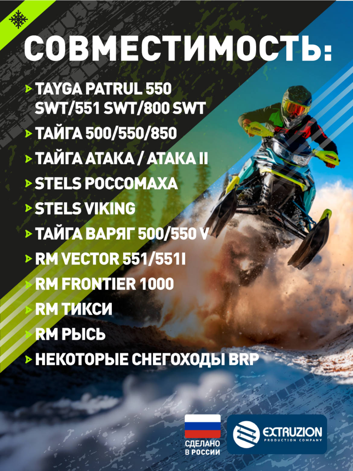 Улучшенная проходимость и управляемость. Повышение плавучести снегохода на рыхлом снегу за счет увеличенной площади контакта Оптимальная геометрия для лучшего контроля на скорости и сложном рельефе Эффективное преодоление глубоких сугробов и сложных участков