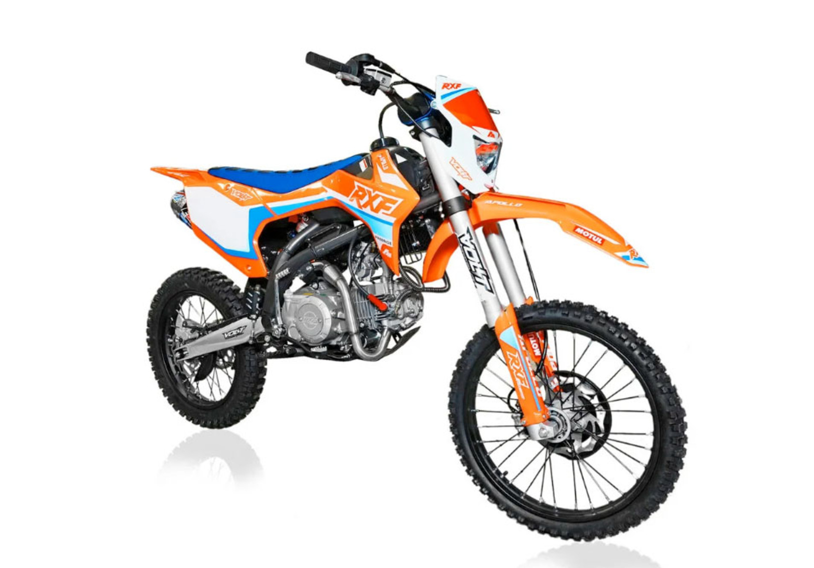 Питбайки компании Apollo родом из Франции. Головной офис компании расположен в Париже. Идеология, заложенная в бренд, носит спортивный характер. Улучшение “породы” происходит в гонках.Модели Apollo RXF (19/16) безошибочно узнаваемы благодаря хребтовой раме с V образным профилем боковой проекции начинающейся от точки крепления маятника под углом 45 градусов. Геометрия рамы была переработана и полностью учитывает размерность применяемых колес, а расстояние от подножек до седла одно из самых больших, что в свою очередь благотворно влияет на езду в стойке.Подвески питов оснащаются вилками и амортизаторами volt, топовые модели имеют регулировки по отбою. На всех моделях установлены двигатели YX, с объемами: 125, 140 и 150 см3 (последний с разными типами ГБЦ) Так же в модельном ряде появился самый кубатурный мотор ZongSheng 190 см3, оснащенный 5 ступенчатой КПП и электростартером.Хочется отметить, что компания Apollo в линейки RXF, закончило полноценную интеграцию и оптимизацию моделей под “большие колеса”. Это можно заметить при взгляде на питбайки в боковой проекции. Расстояние между баком и рулевой колонкой потеряло “зазор”, причина которого крылась в наращивание переднего треугольника под 17 колесо. Сейчас это пространство полноценно поглотил бак, который в свою очередь увеличил объем с 4,7 литров до внушительных 6,5 л. Полностью новый пластик оптимизирован под пропорции “выросшего питбайка”, сиденье стало тоньше и изящнее, боковые щитки увеличены в размерах, глубокий разрез по боковой линии подчеркивает раму, удлиненное заднее крыло и полностью новое передние, не оставляют шансов грязи. Тормозные диски получили пластиковую защиту, амортизатор брызговик, а карбюратор фильтрбокс. Продуманность компоновки питбайка выгодно отличает данную марку от других брендов.Проделанная работа позволила вернуть визуальную целостность модели, которой обладала вся серия Apollo на колесах 14/12.