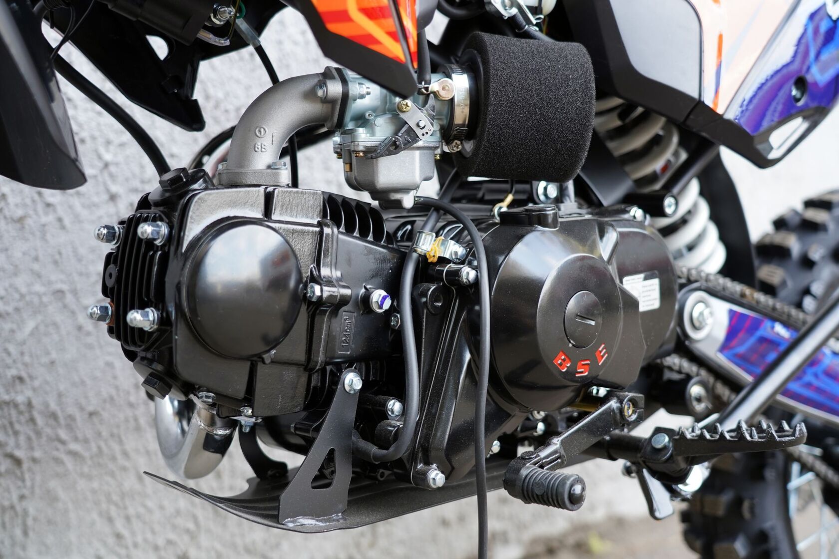 Заводной, маневренный и надежный - вот каким можно охарактеризовать питбайк BSE EX125 17/14. Этот байк представляет собой настоящего монстра в мире мотоциклов, объединяющий в себе мощь и элегантность. Дизайн, который завораживает, скрывает в себе передовые технологии и высокую производительность.Начнем с сердца этого зверя - двигателя. BSE оснащен четырехтактным двигателем Zonsgshen ZS154FMI-2, который гарантирует высокую мощность в 10 л.с. при 7500 об/мин. Этот двигатель имеет максимальную производительность даже в самых экстремальных условиях, а его воздушное охлаждение предотвращает перегрев в самые жаркие моменты.Трансмиссия мотоцикла представлена механической коробкой передач с четырьмя скоростями. Система привода заднего колеса через цепь обеспечивает надежность и плавность переключения передач, делая управление мотоциклом максимально комфортным.Не менее важным является топливный компонент. Система впрыска топлива NIBBI PE19 гарантирует экономичный расход топлива, при этом обеспечивая высокую производительность двигателя. Объем топливного бака в 3.5 литра позволяет долго наслаждаться поездками без необходимости частых заправок.Когда речь заходит о комфорте и управлении, БСЕ становится настоящим лидером. Высокая посадка на высоте 840 мм и регулируемая высота руля делают этот мотоцикл идеальным для различных типов гонок и трасс. А благодаря телескопической вилке передней подвески и моноамортизатору с регулировкой жесткости задней подвески, каждая поездка становится максимально комфортной и плавной.