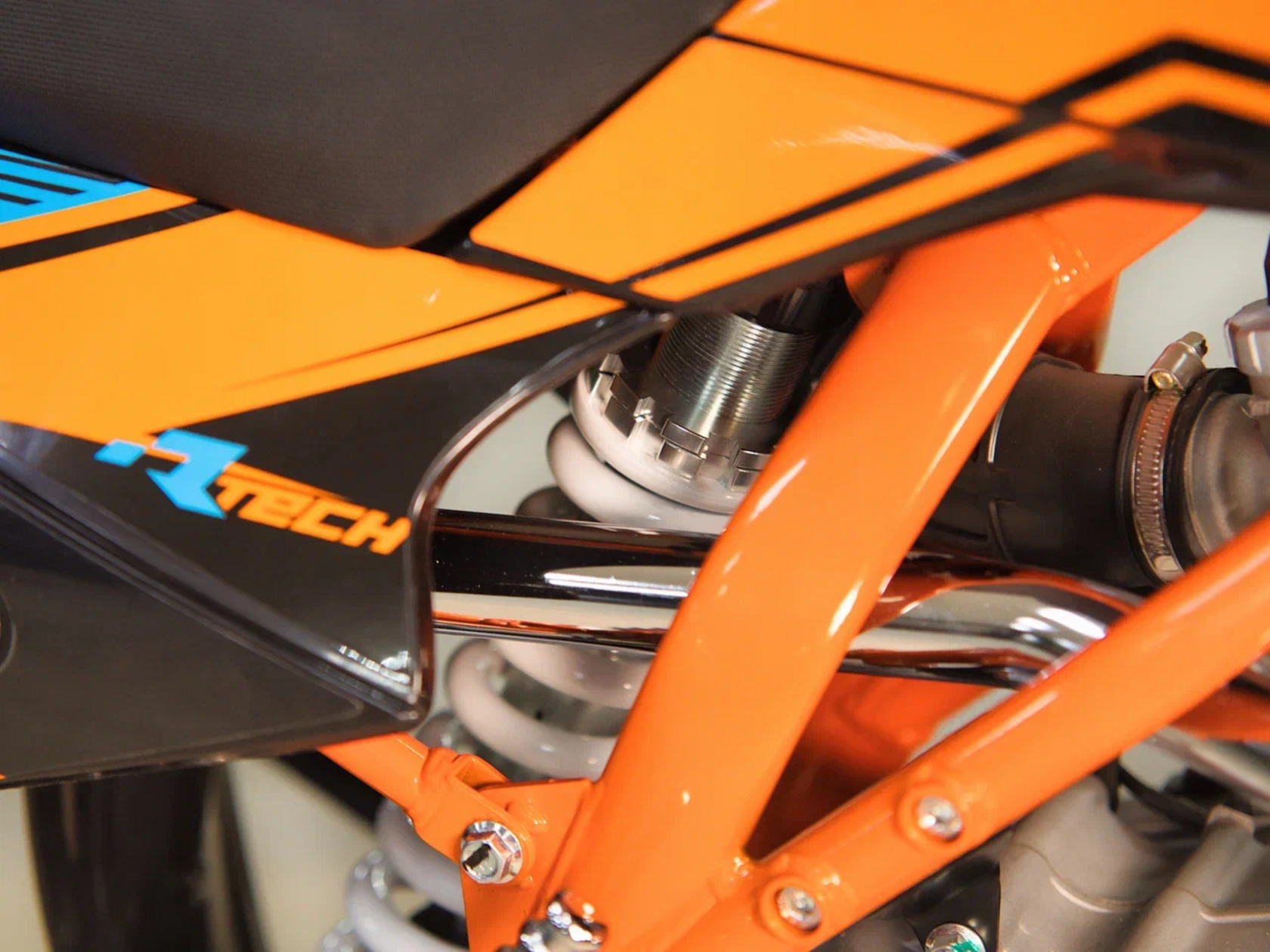 Питбайк KAYO Evolution K125EM KRZ – идеальный снаряд для наработки первого опыта в мотокроссе и эндуро, который можно использовать на лёгких кроссовых трассах и дорогах с различным покрытием. Удобный, простой и надёжный мотоцикл, который полностью оправдывает свою цену.Одноцилиндровый 4-тактный двигатель воздушного охлаждения объёмом 125 см3, выдаёт 9 л.с. Карбюратор NIBBI PE19 обеспечивает бесперебойную работу техники в самых жёстких условиях эксплуатации, простоту и лёгкость в обслуживании, а также неприхотливость к качеству топлива. Питбайк оснащён механической 4-ступенчатой коробкой передач с формулой “N-1-2-3-4”.Мотоцикл имеет вес всего 78 кг. Усиленная рама из хром-молибденового сплава и подвеска позволяют эффективно амортизировать удары при езде по неровностям и препятствиям на трассе. Передняя подвеска — телескопическая вилка перевёрнутого типа длиной 770 мм, задняя — моноамортизатор длиной 360 мм. Оба компонента подвески являются нерегулируемыми. Рама и пластик являются собственной разработкой производителя. Мотоцикл оснащён классическими стальными спицованными колёсами диаметром 17 дюймов спереди и 14 дюймов сзади. Эффективное и безопасное замедление с любых скоростей обеспечивают гидравлические дисковые тормоза с лепестковыми дисками.Высококачественная износостойкая резина с развитым протектором отлично держит дорогу на различных типах покрытия. Байк оснащён как системой запуска двигателя при помощи кнопки электростартера, так и рычагом кик-стартера. Питбайк имеет вместительный топливный бак на 5,7 л, что гораздо больше, нежели у других байков этого класса.Питбайк оснащён защитой кистей рук, стальной защитой картера и яркой линзованной фарой. Он имеет агрессивный дизайн с яркой и контрастной графикой. Если вы ищете послушный, компактный, шустрый и красивый питбайк, считайте, что вы его нашли. Это один из лучших мотоциклов для обучения и первых шагов в эндуро и мотокроссе. Он отлично подойдёт как для гонок на трассе, так и для покатушек по пересечённой местности.