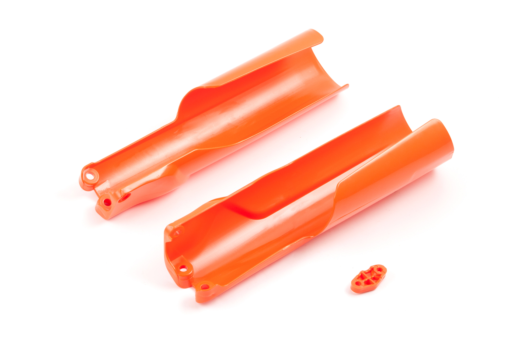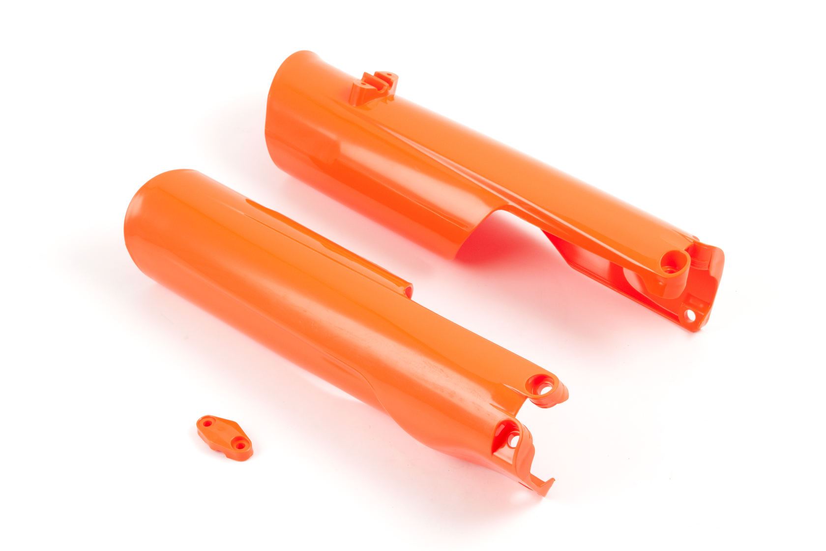 Защита перьев вилки оранжевого цвета для мотоциклов BRZ SX8. Предназначена для вилок диаметром 48 мм различных производителей (HT, WP, MNT). Выполнена из ударопрочного пластика. Является полным аналогом оригинальной детали KTM с артикулом A46001094000C1. Обеспечивает надежную защиту перьев вилки от механических повреждений, грязи и абразивного износа. Прямая установка без доработок.