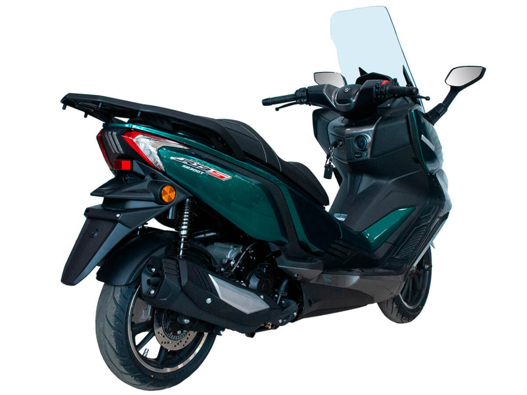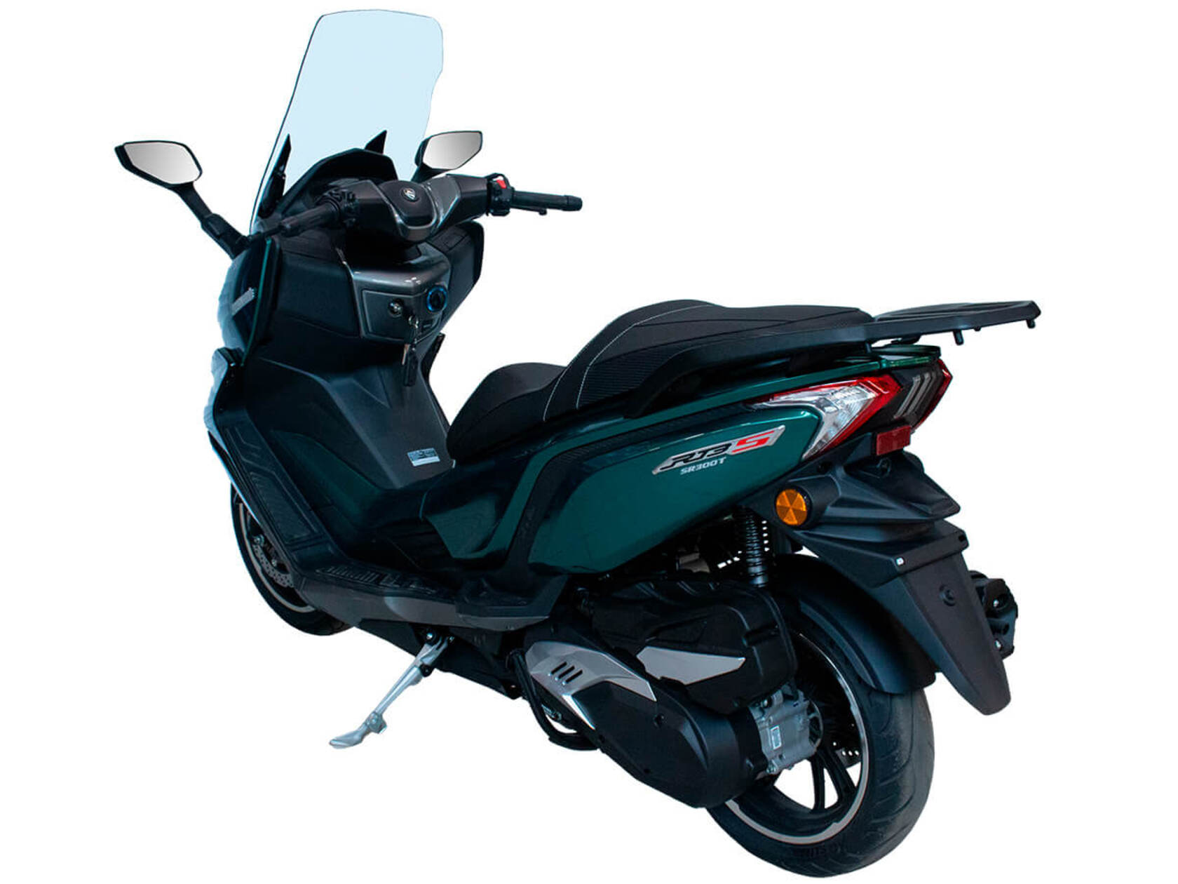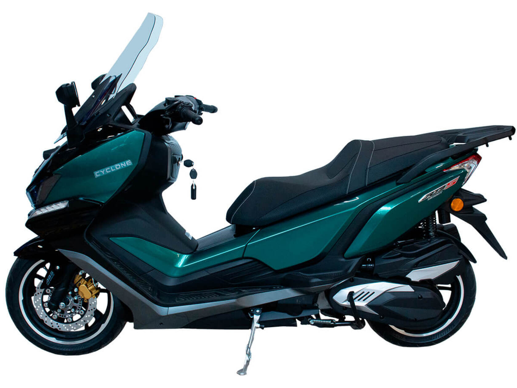 CYCLONE RT3S (SR300T) – городской максискутер, сочетающий в себе мощный двигатель, богатую компоновку и изысканный современный дизайн.Силовая установка представляет собой одноцилиндровый четырёхтактный двигатель объёмом 289 см3 имеет мощность 25 л.с. при 7500 об/мин. Максимальный крутящий момент достигается на 6000 об/мин и составляет 26,5 Н·м. Эти показатели позволяют RT3S по скоростным характеристикам конкурировать не только со скутерами, но и со среднекубатурными мотоциклами.Инжекторный впрыск топлива с блоком управления BOSCH увеличивает топливную экономичность, а также позволяет добиться высокой приёмистости и неприхотливости агрегата. Жидкостная система охлаждения не допустит перегрева двигателя даже при самом агрессивном вождении.На скутер установлен вариатор, который обеспечивает динамичную езду как в условиях городских пробок, так и на скоростных автострадах.Колёса скутера имеют литые диски диаметром 14 и 15 дюймов. Колёса обуты в бескамерные покрышки TIMSUN. Клиренс скутера составляет 155 мм. Подвеска представлена классической телескопической вилкой спереди и двумя газонаполненными амортизаторами сзади. Ход передней подвески составляет 129,5 мм, задней – 97,5 мм.Сухой вес скутера составляет 202 кг. Эффективное и безопасное замедление с любых скоростей обеспечивают гидравлические дисковые тормоза с ABS фирмы BOSCH спереди и сзади.Объём топливного бака этой модели – 17 литров.Модель имеет два видеорегистратора, электрорегулируемое ветровое стекло, подсветку пультов, возможность бесключевого доступа, датчики давления в шинах и USB-порт.Скутер сочетает в себе отличные технические характеристики, комфорт и надёжность, что позволяет вам ощутить настоящую свободу и всегда быть в ритме мегаполиса.