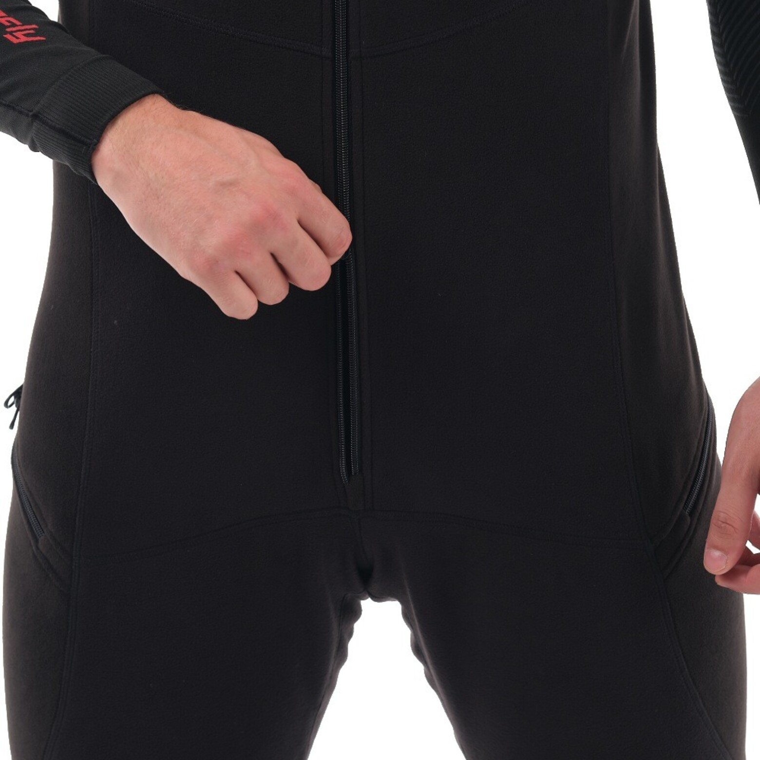Полукомбинезон утеплённый унисекс (черный)Черный полукомбинезон из флиса и виндстоппера – разновидность термобелья, обеспечивает повышенную теплоизоляцию в области груди, спины, коленей и паха. Используется как "второй слой": надевается на тонкое термо под штаны или комбинезон. Эта простая вещь сделает спорт и активный отдых зимой значительно более комфортным: легкий и теплый полукомбинезон по достоинству оценят те, кто передвигается на технике (снегоход, сноубайк, квадроцикл), катается на сноуборде, занимается зимней охотой или рыбалкой. В качестве утепляющего слоя пригодится в любой холодный период года: весной и осенью можно носить полукомбинезон под вейдерсами и непромокаемым мембранным костюмом.Сшит из двух тканей: дышащий виндстоппер (плотность 350 г/м²) и эластичный флис (плотность 185 г/м²). Состав тканей: 100% полиэстер. Материалы обладают прекрасными теплоизоляционными свойствами, надежно защищая от холода. Не вызывают раздражения и аллергических реакций, что особенно важно для людей с чувствительной кожей.Функциональные характеристики:Комбинация 2 тканей, гармонично дополняющих друг другаПомогает не замерзнуть в суровых погодных условиях, в том числе на ветреных участкахОтводит влагу к верхнему слою: тело остается сухим при интенсивных физических нагрузкахСкроен анатомически, хорошо садится по фигуре, не сковывает движенийБлагодаря мягкости и хорошей растяжимости не давит, не натирает кожуДлинная центральная двухзамковая молния открывается сверху и снизу, что удобно при надевании и облегчает мужской туалетДвухзамковая молния в нижней части спины («бомболюк») незаменима в особых случаях при длительном нахождении в экипировкеБыстро сохнет, не линяет, устойчив к износу, долго не теряет свой первоначальный видМодель унисекс, подойдет как мужчинам, так и женщинам.Температурный режим: от 0 до -30 С.Сделано в России