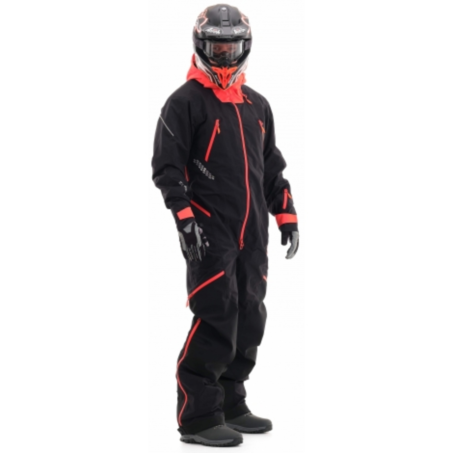Комбинезон предназначен для снегохода и сноубайка. Надежно защитит от ледяного ветра и мокрого снега. Ткань верха дополнительно содержит тефлоновое водоотталкивающее покрытие. Внешние молнии влагозащитные. Проклеены все швы. На рукавах есть эластичные манжеты, на штанинах снегозащитные юбки с петлёй для фиксации к ботинкам. При закрытой вентиляции и карманах комбинезон герметичен.Функционал комбинезона тщательно продуман и зарекомендовал себя среди снегоходчиков и сноубайкеров. Светоотражающие элементы есть со всех сторон. Семь карманов покрывают все потребности райдера, в том числе для ски-паса, телефона, и теплые, для согревания рук. Есть удобная петля под тангенту рации и кольцо D-ring для ключа горного снегохода. Центральная молнии с тремя замками: открывается сверху и снизу. Несъемный капюшон с двойной утяжкой. Для удобства приема пищи и воды во время стоянки – есть расширения на воротнике, защищает от ветра в расстёгнутом виде. В помещении можно снять верхнюю часть комбинезона и воспользоваться регулируемыми лямками - подтяжками.
