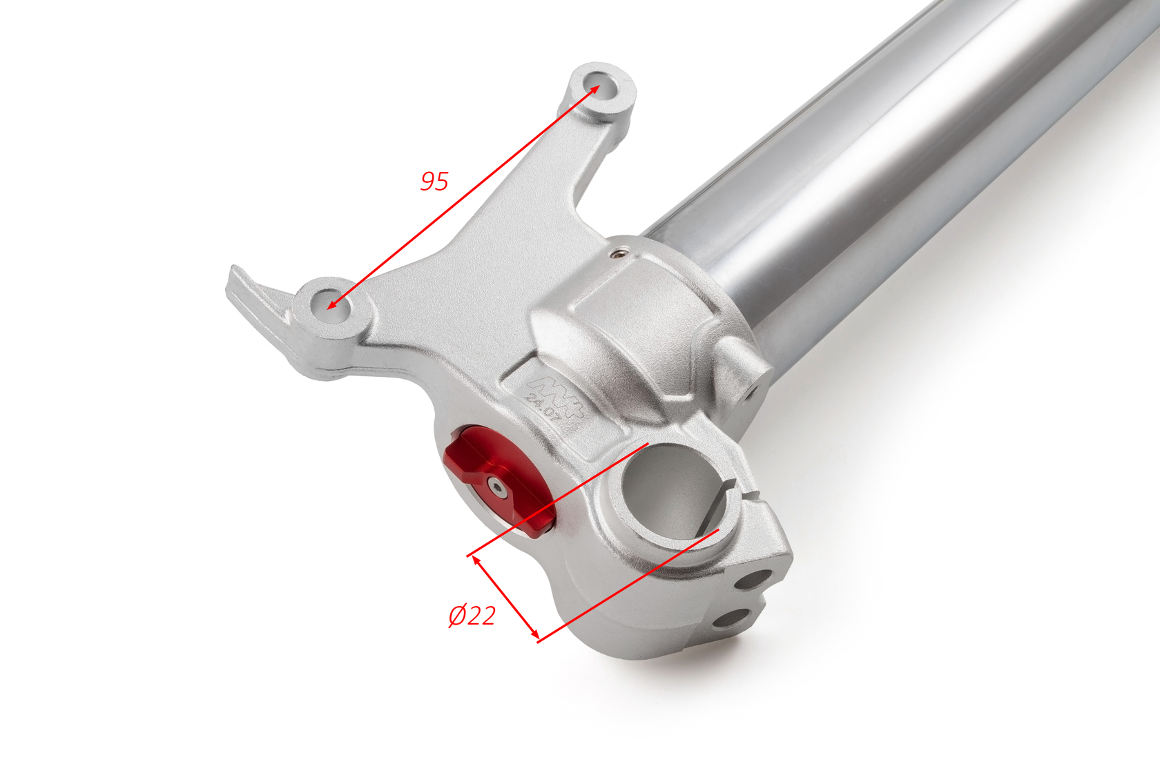 Перья вилки для полноразмерных эндуро мотоциклов с шасси К8. Длина 910 мм, диаметр пера 48 мм. Однокартриджная конструкция с регулировками сжатия и отбоя. Имеют клапан для сброса воздуха и крепление под суппорт типа KTM. Выполнены в бронзовом цвете.